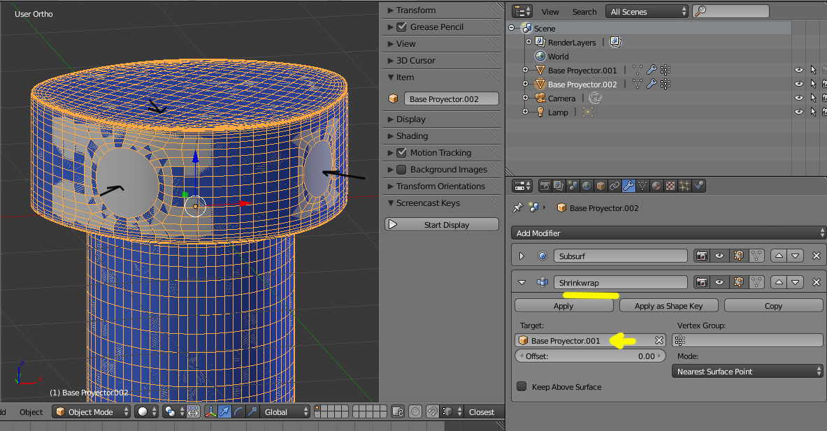 Y en último caso que la forma se deformara por los nuevos loops, lo que se puede hacer es un Shrinkwarp de la nueva forma sobre la forma original, o sea haces primero un duplicado y haces los agujeros y luego le proyectas el Shrinkwarp por si se ha deformado o los vértices no han cogido bien la forma.