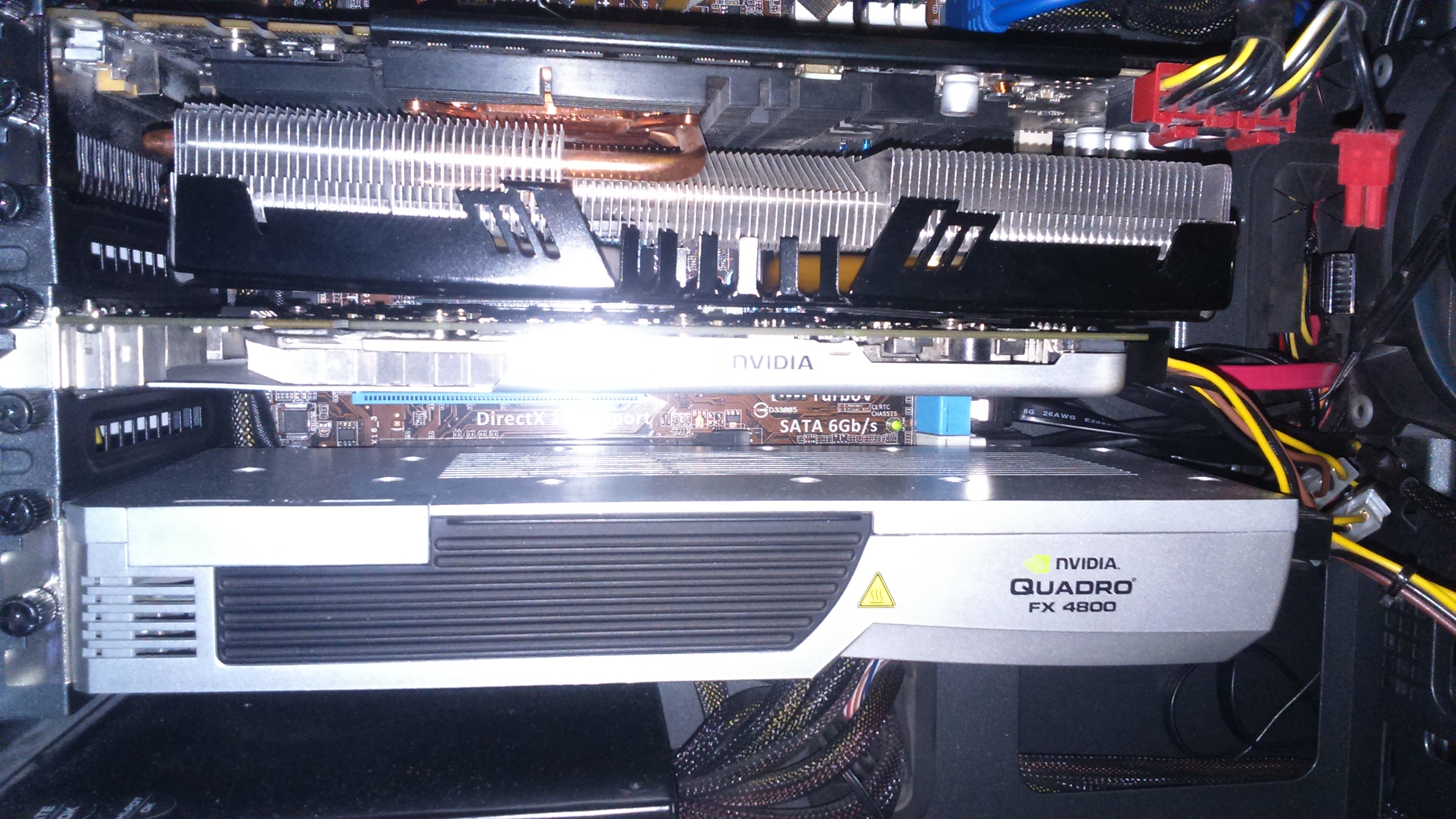 Ya he realizado las pruebas con una Quadro fx3700 con la siguiente configuración, los dos monitores a la quadro3700 la quadro4800 para modelar con Rhinoceros y la GTX 580 para render, con la configuración de cambio de imagen del escritorio cada treinta segundos, ya no notas esas ralentizaciones es que hacia modelando cuando cambiaba la imagen, aparte ganas mejora de visualización en los visores de Rhinoceros (es curioso parece ser que, arrastrar los dos monitores de 24 con la función de cambio de imagen en el escritorio le restaba potencia a la quadro) la única pega es que como el slot esta pegado a la GTX, lo que ha plena carga en render, la temperatura no pasaba de 72 grados, ahora alcanza 96 y subiendo, lo he parado por si acaso dañaba la tarjeta.