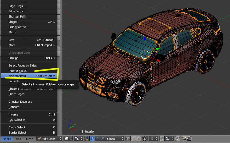 2) Probando lo de select Non_Manifold me han pasado dos cosas. La primera qué el coche esta dividido en subpartes y cuando cojo más de una subparte no me permite pasar el modo edición, por tanto, aunque consiga sellar cada una de las partes si después entre ellas están sin sellar seguiré teniendo el mismo problema. Segunda, probando el comando Non_Manifold con diversas subpartes la gran mayoría de los elementos que quedan seleccionados están en las partes exteriores que están en contacto con la resta de subpartes, no hay algún modo de unirlo todo en el mismo conjunto? O alguna otra manera de lidiar con esto. Muchas gracias por tu tiempo, saludos.