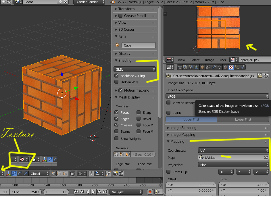 La textura está bien pues la veo en modo textura lo que creo que está parando es que toca activar la visualización del mismo modo que en modo textura qué hay que pasarlo del modo multi textura a GLSL, yo lo tengo en modo GLSL para modo objeto o edición y se ven las texturas, pero cuando entro en modo juego parece que pasara a modo multi textura.