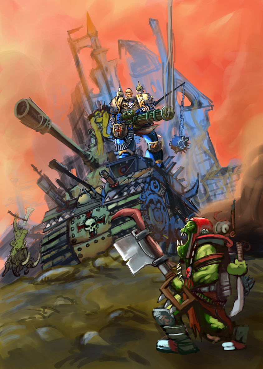 Hola Cornelius. Pues la verdad es que, a grandes rasgos me gusta la planta de la ilustración. Por ejemplo, el hecho de que hayas descompensado la línea de horizonte, el tanque saliendo de detrás de la colina, ese personaje que parece venir corriendo sobre un cuadrúpedo a lo lejos, los edificios de detrás derruidos, tiene muchos elementos que no están mal y de se por el detalle que cuelgas a posteriori que si terminaras el boceto tendría un acabado bastante bueno, lo que a mí no me termina de funcionar es justamente ese personaje que tienes en primer plano, que se te ha quedado en una postura muy de perfil y muy aplanado. No deberías buscar volumen a posteriori mediante sombras, texturas y demás, sería una pena invertir tanto tiempo tratando de ganar volumen cuando el problema está en la base del dibujo de este personaje en concreto. Por eso, aún estando en este estadio, yo borraría ese personaje y lo plantearía en una postura 3/4, para seguir en la buena línea qué lleva el resto de la imagen. Sé que es una movida lo que te estoy diciendo, pero bueno, el dibujo es así, hay que caer para levantarse. Ánimo, en cualquier caso, así en general, se nota el trabajo que le has echado.