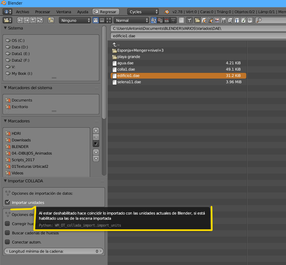 - DAE: Es la única forma qué he encontrado para comunicar los archivos entre ambos software, pero me los importa a Blender con una escala al menos 10 veces mayor al original. La unidad métrica en ambos programas esta puesta en metros.
