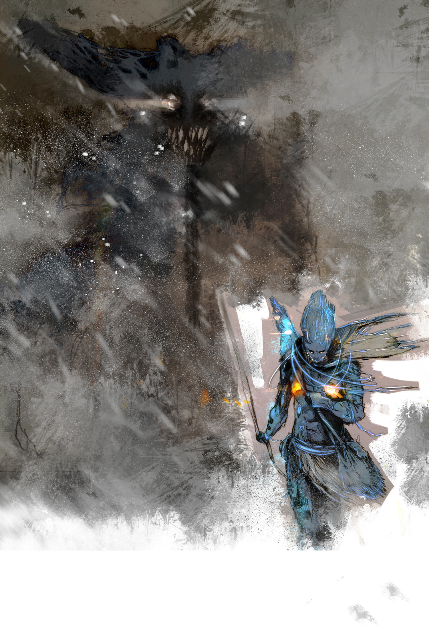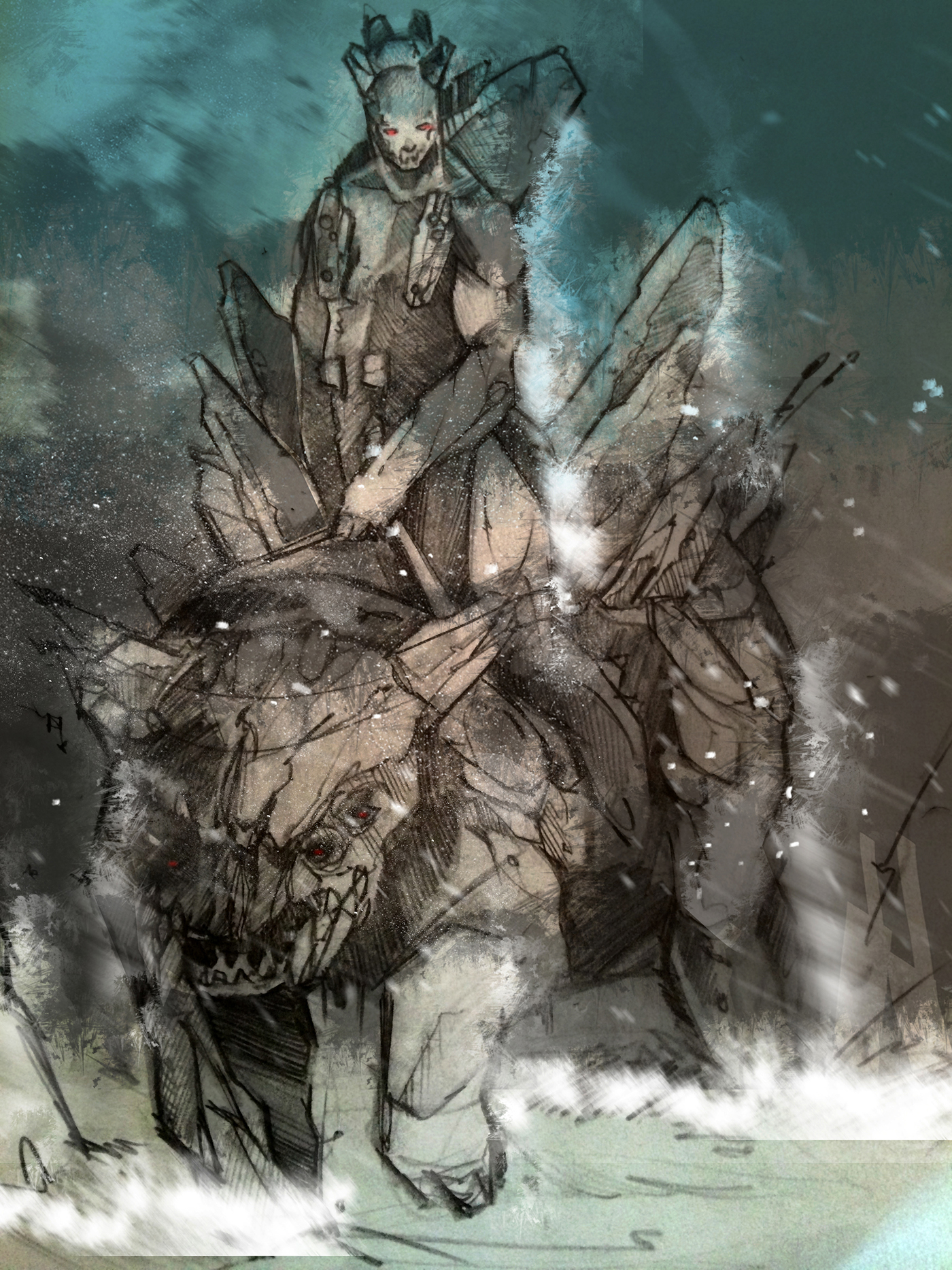 Me encanta este último del personaje sobre el cuadrúpedo, sobre todo el efecto que le da la nieve y la sensación de viento. Un poco más de nieve no le vendría mal, me encanta la nieve porque rara vez la he visto. Muy buenos los concepts.