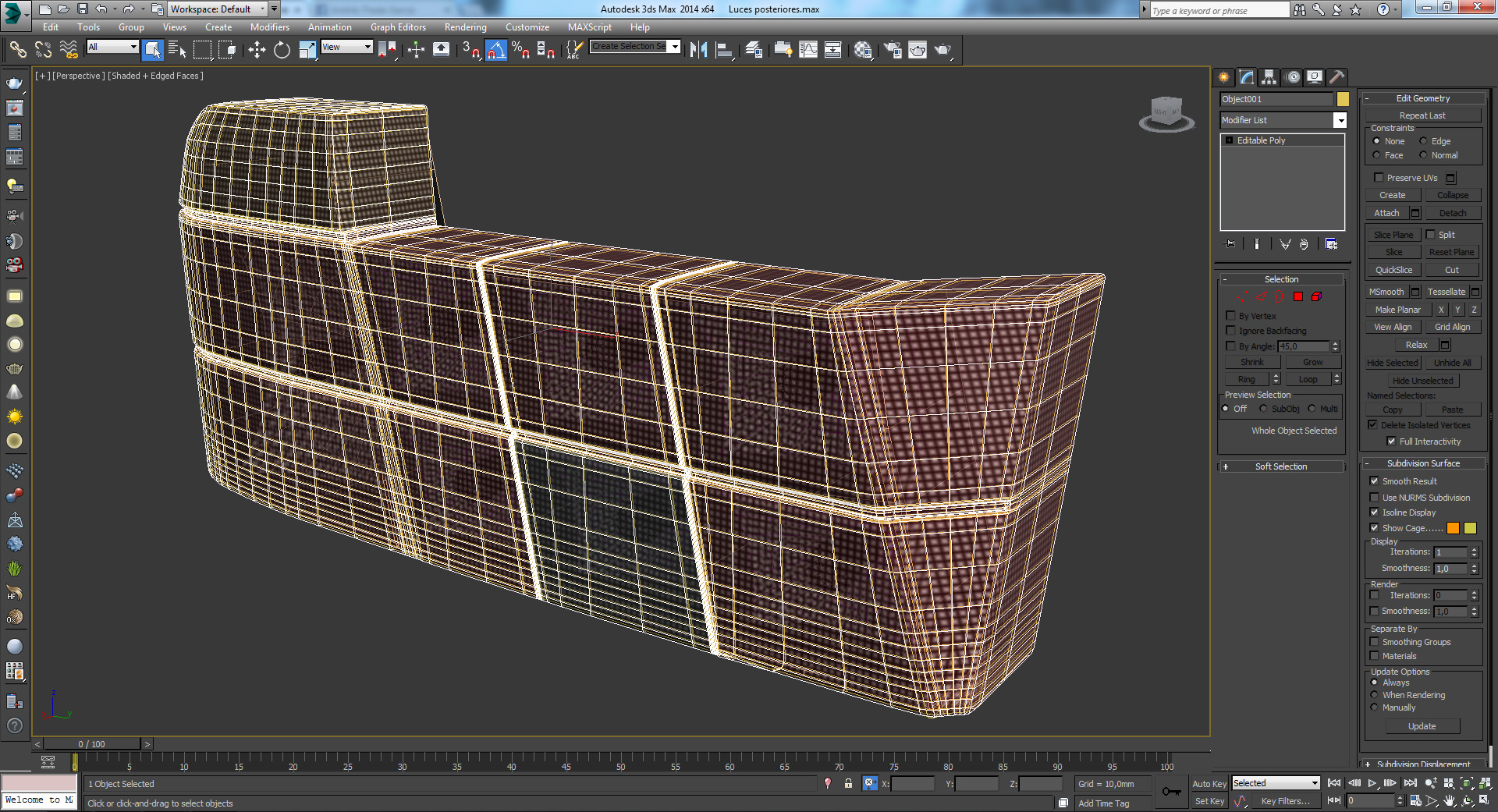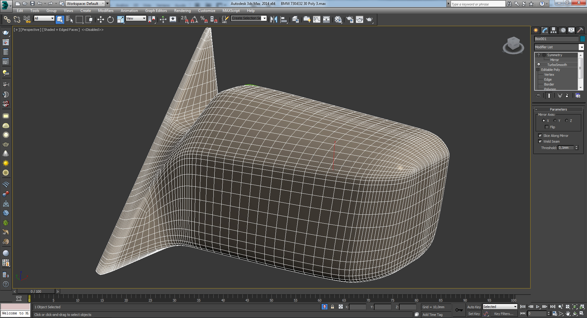 Aquí comienza el proceso de refinar la malla, es un Edit Poly con dos modificadores Symmetry y MeshSmooth con método NURMS de subdivisión.