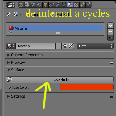 La forma de trabajar los materiales es completamente distinta a Blender render, pero si tienes un material puesto en render Blender, y lo quieres cambiar para trabajarlo con Cylces, hay que pinchar sobre una barra qué pone Use nodes y eso te pondrá un primer material de tipo Diffuse que luego en la composición de nodos de materiales puedes mezclar, (un etc muy largo).