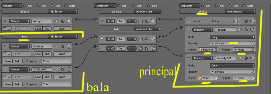 Si miras en pantalla veras que el cubo está animado, y cada vez que presiones Tabulador, dispara una bala. Si toca a la Mona cambia el valor del cubo llamado principal, al nombre que tiene la propiedad.