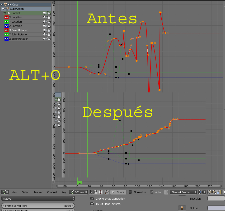 Me siguen viniendo dudas al intentar practicar con ciertas opciones del Graph Editor de Blender. He mirado un enlace que me pasó Solimán y el cual le agradezco porque me a ayudado mucho. Además, he mirado en la wiki de Blender y en otras páginas, pero sigo sin entenderlas.