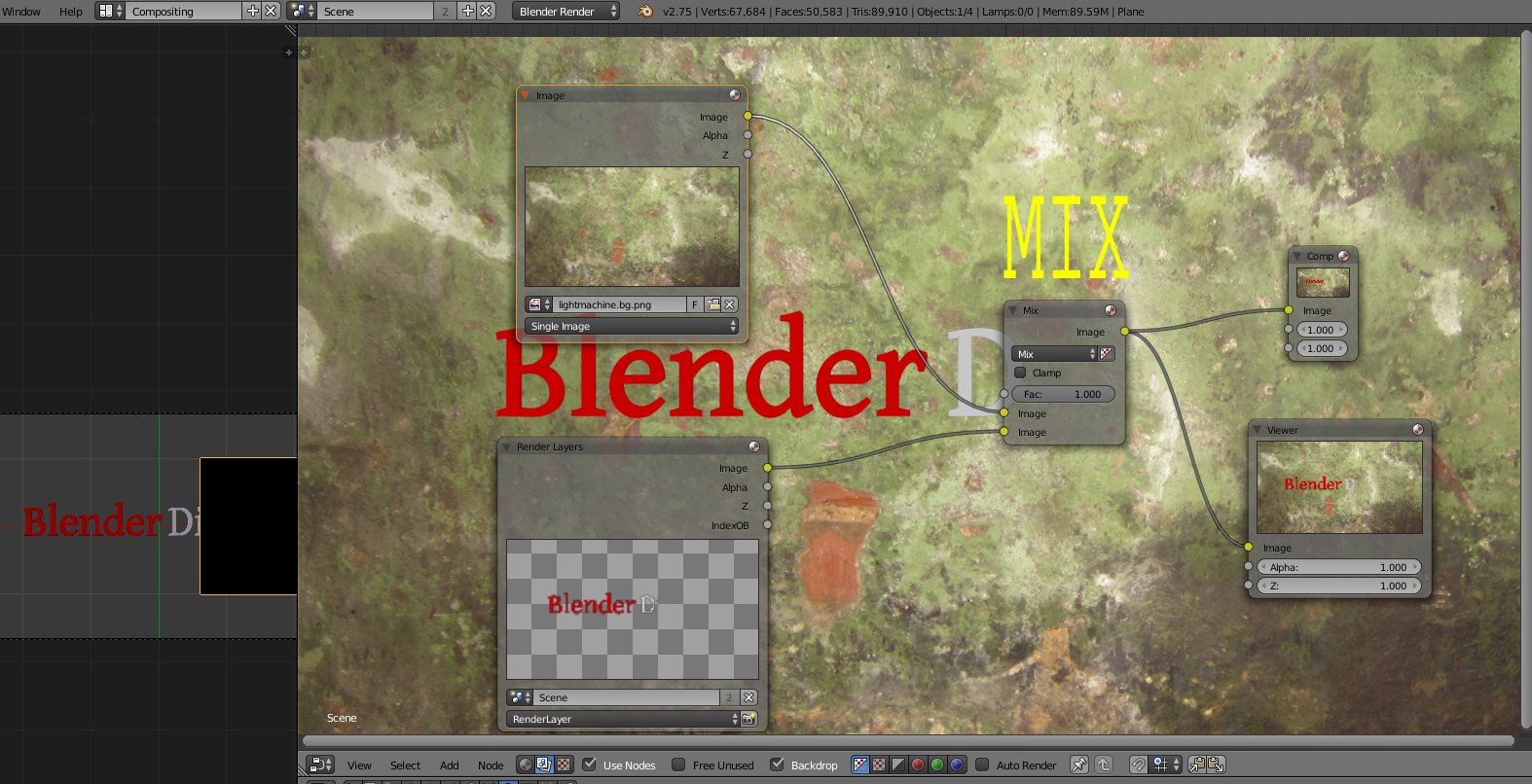 Y luego en el compositor de nodos solo tienes que mezclar la imagen que quieras de fondo con la escena (el texto y el plano animado).