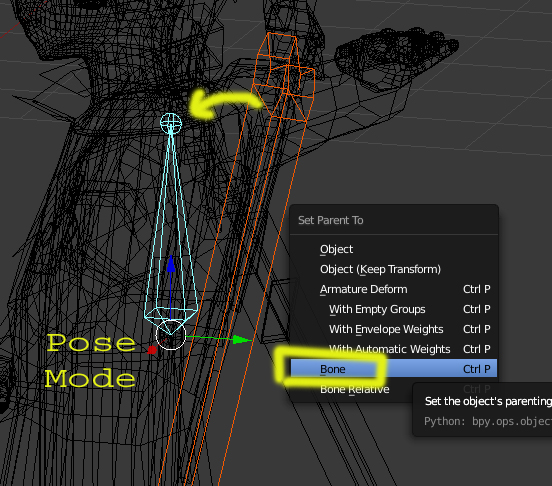 Lo que he hecho es, seleccionar la Vaina. Sepárala con letra P, y se emparenta al hueso de la espalda, pero en forma BONE