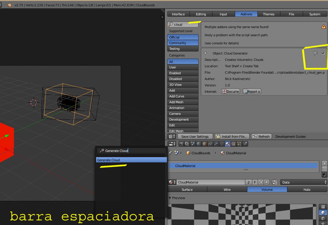 Este ADON se activa desde User preferencias > Addons y luego, con la barra espaciadora se escribe CLOUD por ejemplo, y ya te slae la opción del generador, donde solo debes de tener el objeto seleccionado para qué se convierta en una nube.
