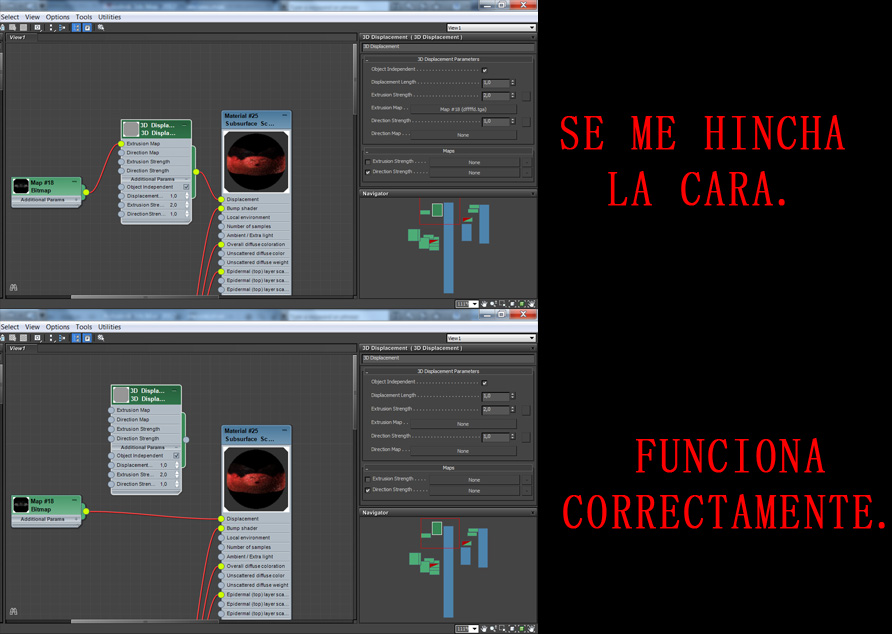 Yo estoy usando el Subsurface Scattering fast skin + Displacement, cuando uso la ventana 3D displacement se me hincha la cara, aunque haga lo que me dijiste, ahora, cuando desconecto la ventana y usa el map directamente en el cuadro de displacement funciona correctamente. Te muestro la imagen.