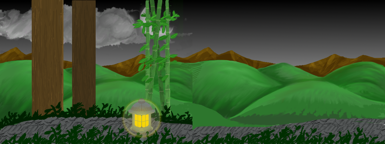 Y este es el escenario (previo total) que pinté en Gimp y que tengo que pasar integro a 3d (realmente lo más sencillo porque modelar entornos se me da mejor).