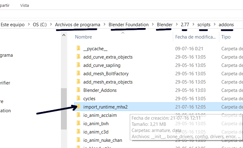 Pues bien, lo siguiente es copiar o cortar la carpeta llamada (import_runtime_mhx2) y pegarla en la carpeta de Addons de Blender, que en mi caso tiene la siguiente ruta: