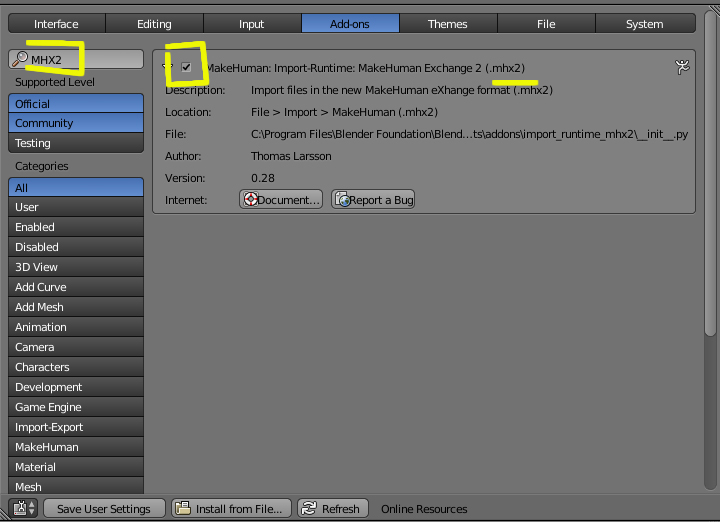 Pero esto se puede solucionar con dos carpetas, que son, un addon para Blender de exportación llamado MHX2 y un plugin que podemos colocar en la carpeta del Makehuman para qué tenga esta opción de exportar en.mhx2.