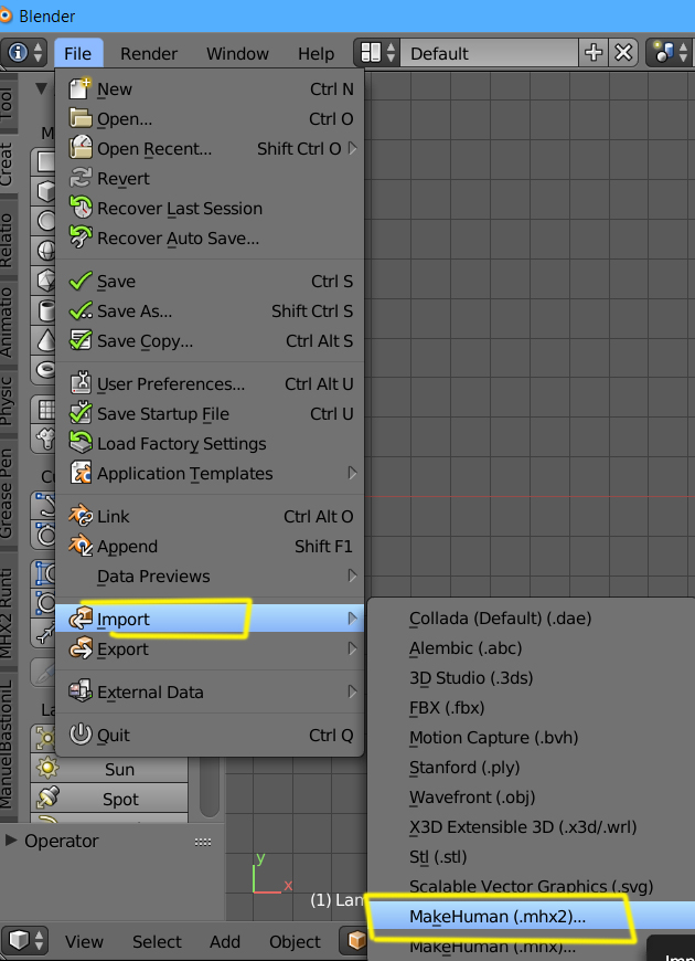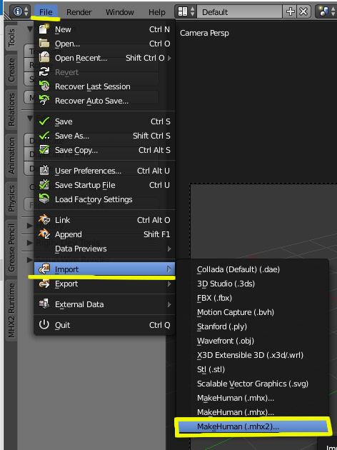 O sea, abres Blender y hace un Import > Makehuman (.mhx2).