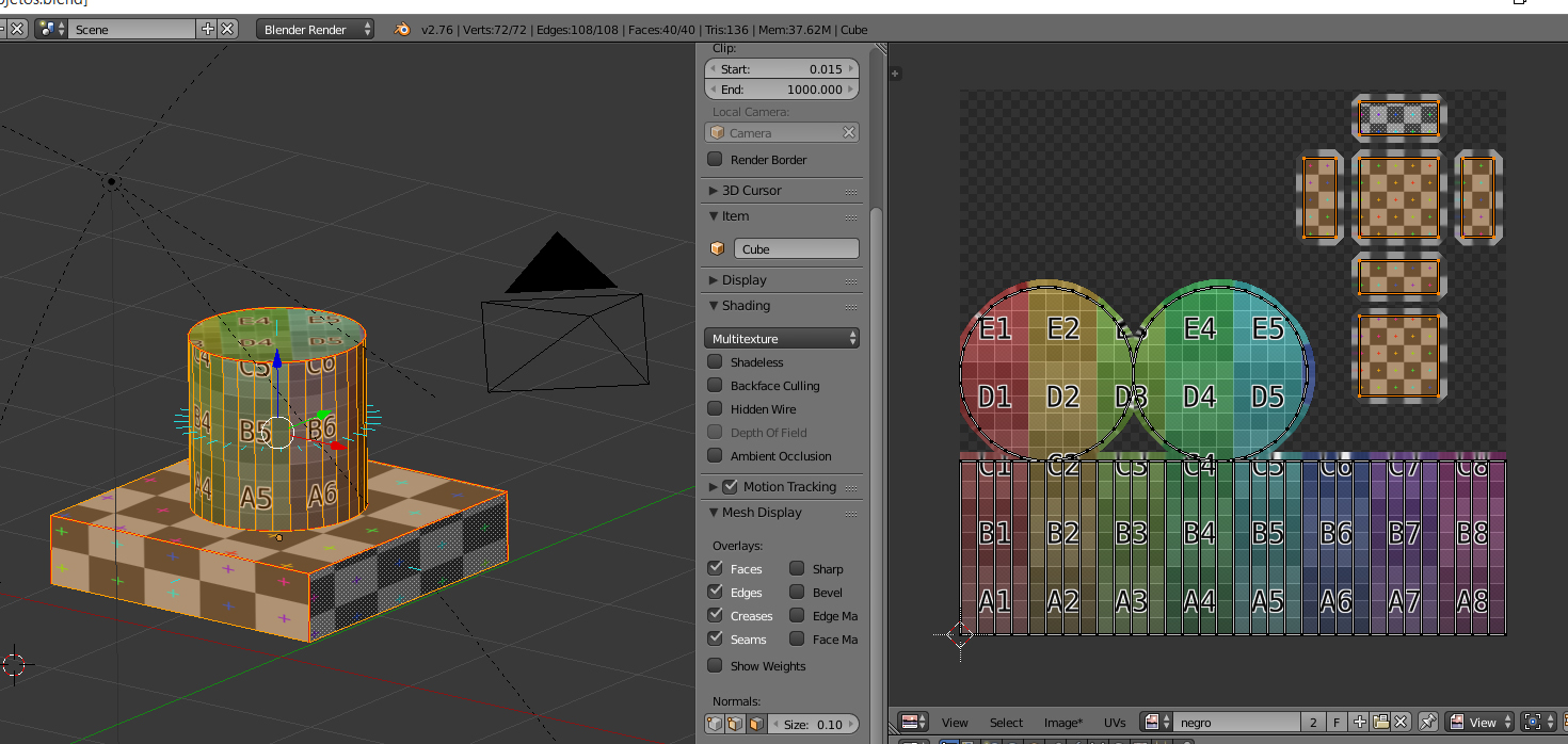 Una vez tienes los dos objetos, tendrás dos materiales diferentes con sus texturas diferentes, se crea un nuevo material y una nueva textura, se hace sobre esa nueva textura un UV y te tendrán que salir las dos desplegadas en la nueva, se desactiva la textura de imagen nueva donde se va a hacer el bakeo.