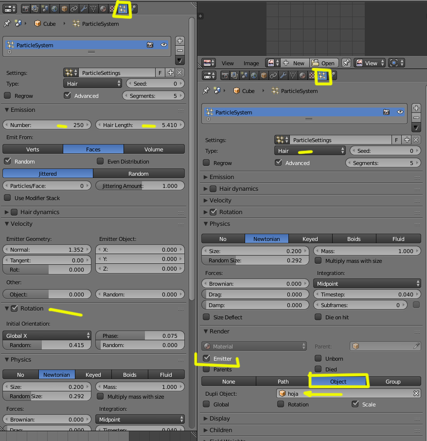 A la esfera se le ponen partículas, y le indicas que quieres que sea a través de un OBJECT (objeto, que será el nombre de la hoja qué hemos modelado antes).