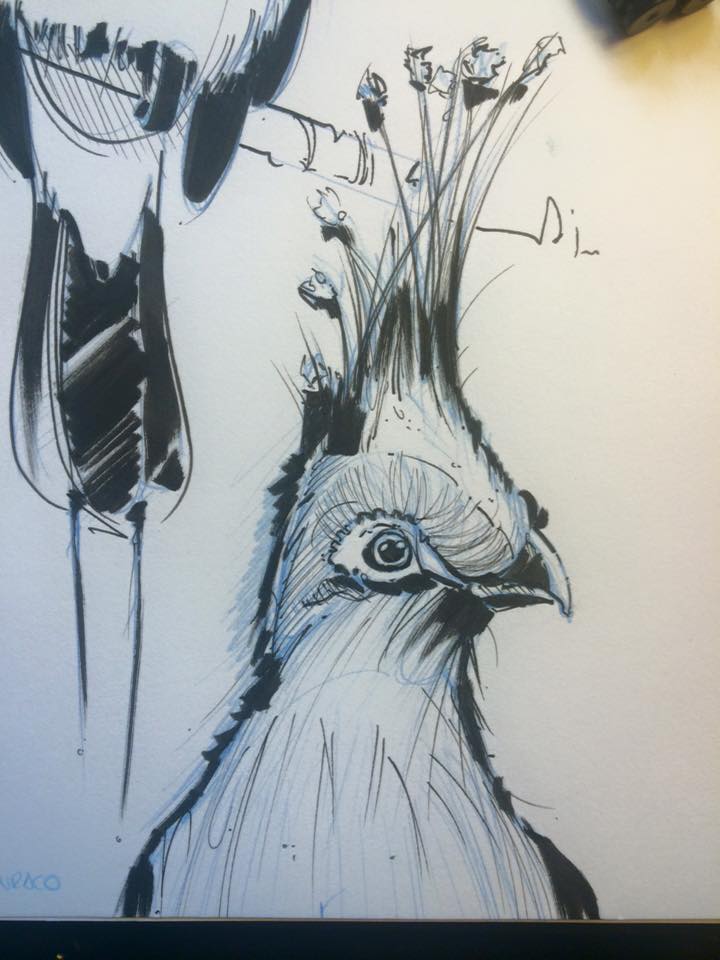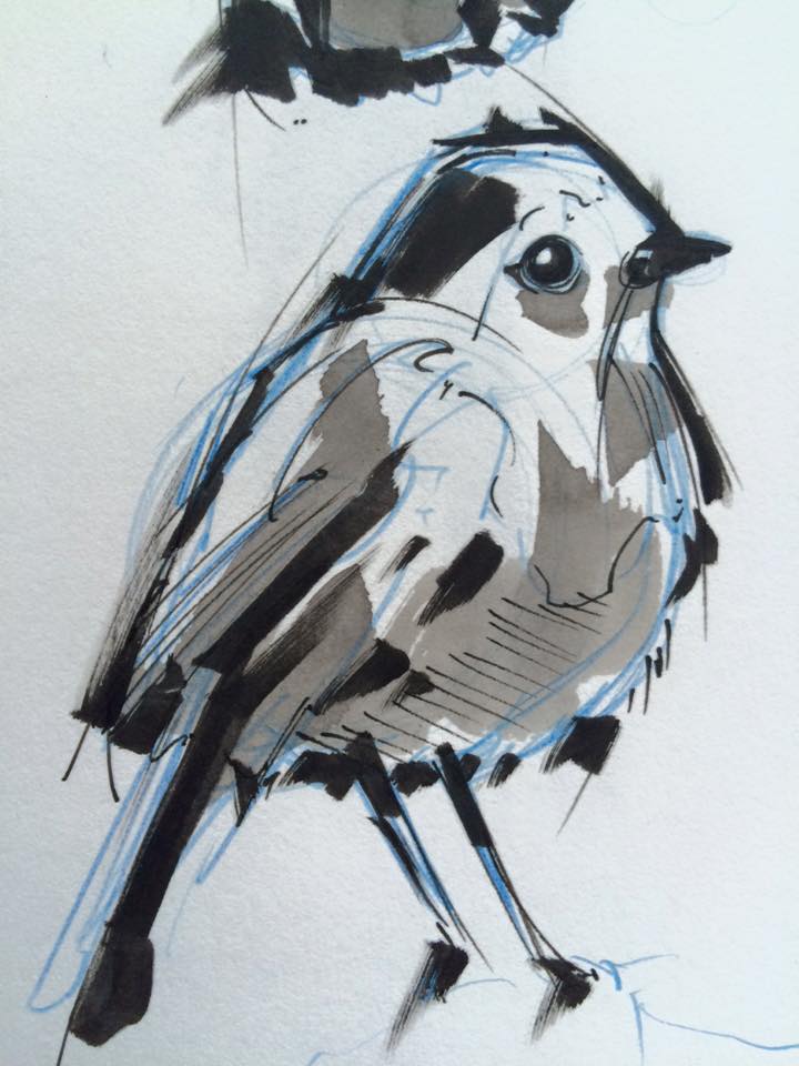 Algunos bocetos durante el almuerzo, pajaricos (tinta y portaminas azul en alguno de ellos, otros directamente dibujando con la tinta).