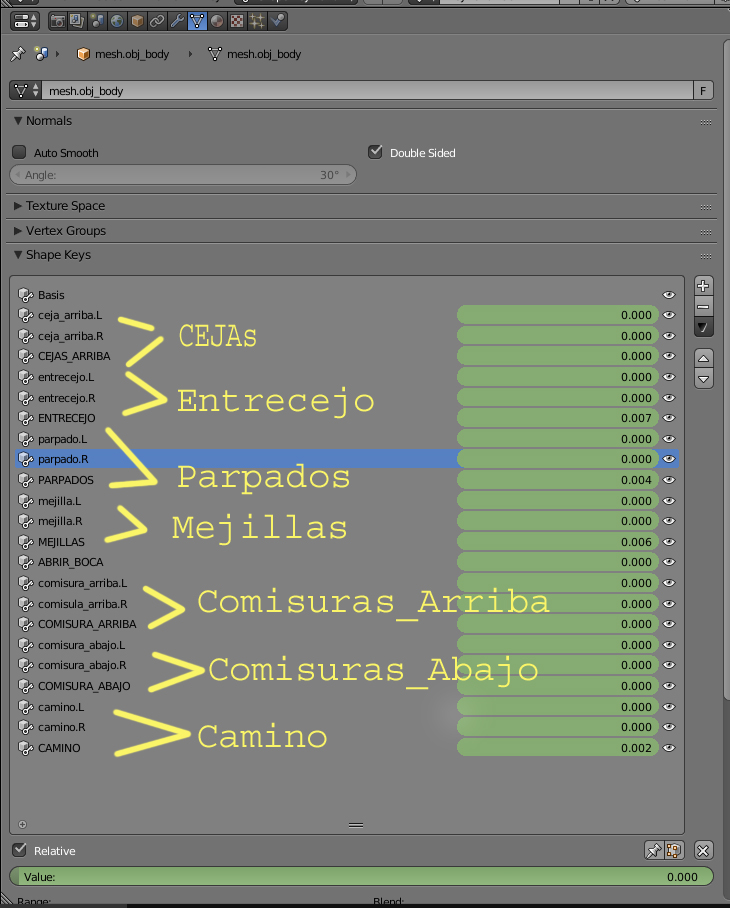 Bueno, ahora se trataría de conseguir un número de Shapes no muy elevado, donde cada uno se centre en una zona del modelo. O dicho de otra manera, no me vale el crear una simple cara con una sonrisa con las cejas elevadas, sino el conseguir esa sonrisa (o lo que sea) moviendo los diferentes shapes trabajándolos por zonas individuales.