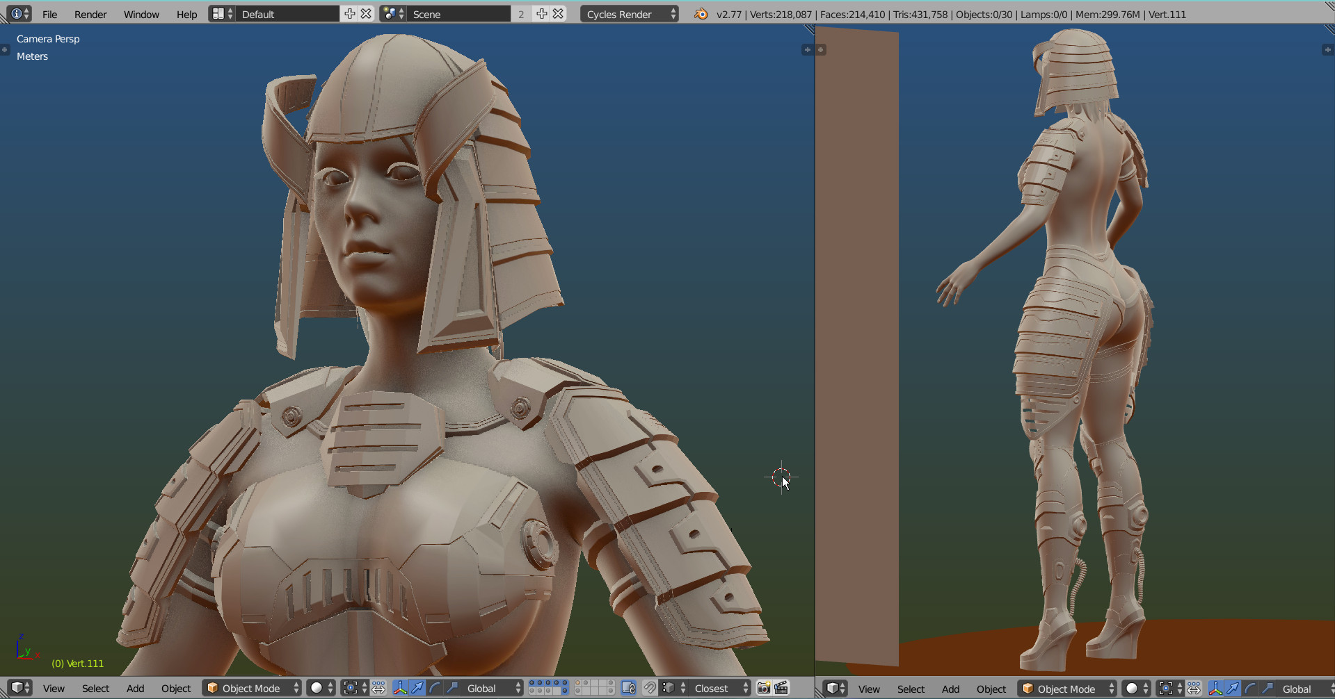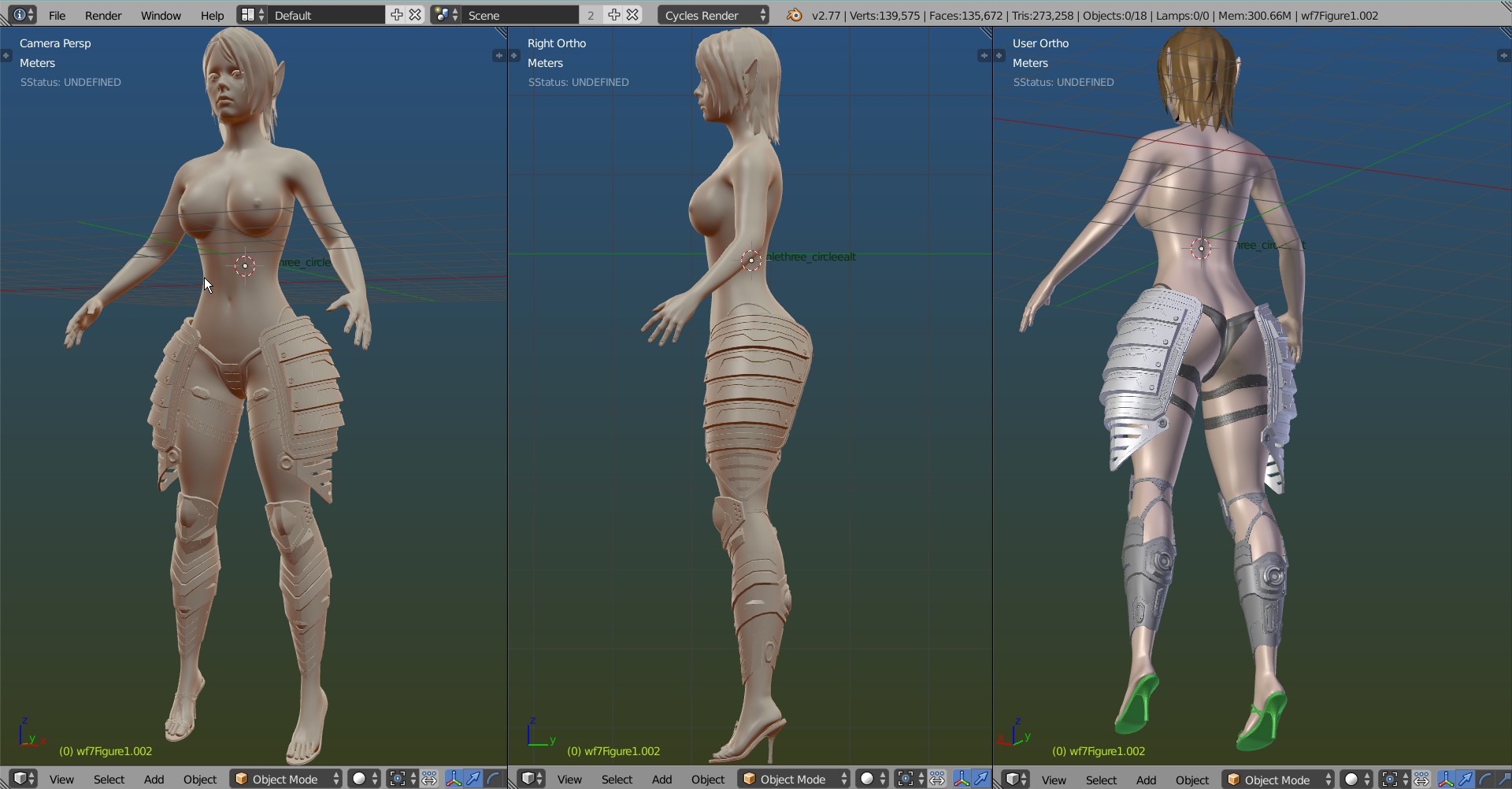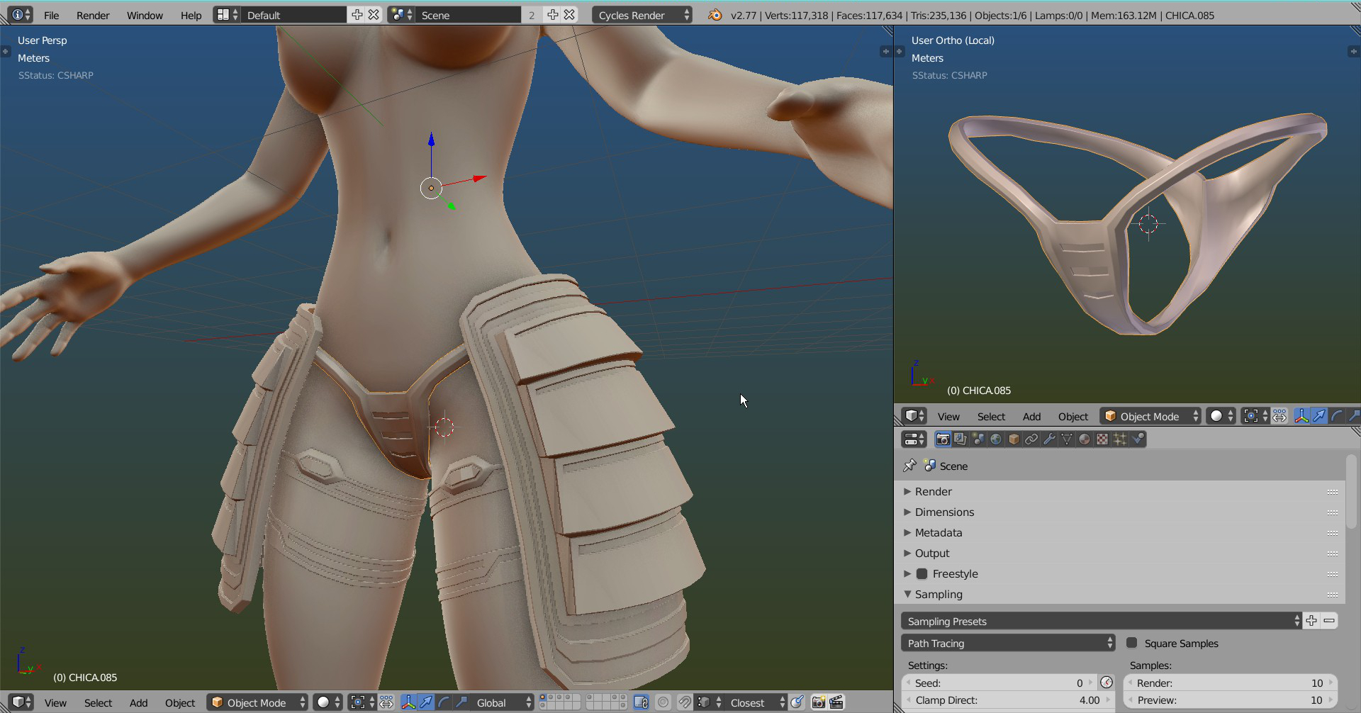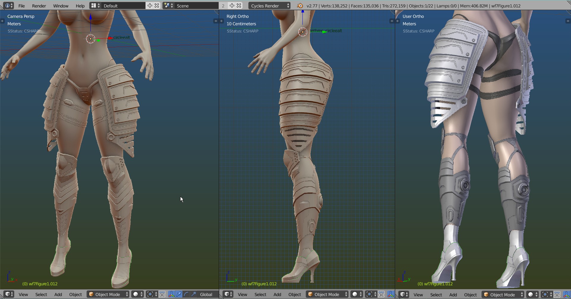 Hola a todos, hace algunos días comencé a modelar esta chica en los pequeños tiempos libres que tengo, la base femenina está en MakeHuman, luego algunos retoques con Blender para lograr las caderas y los pechos a mi gusto más otros retoques. Y a modelar la armadura.