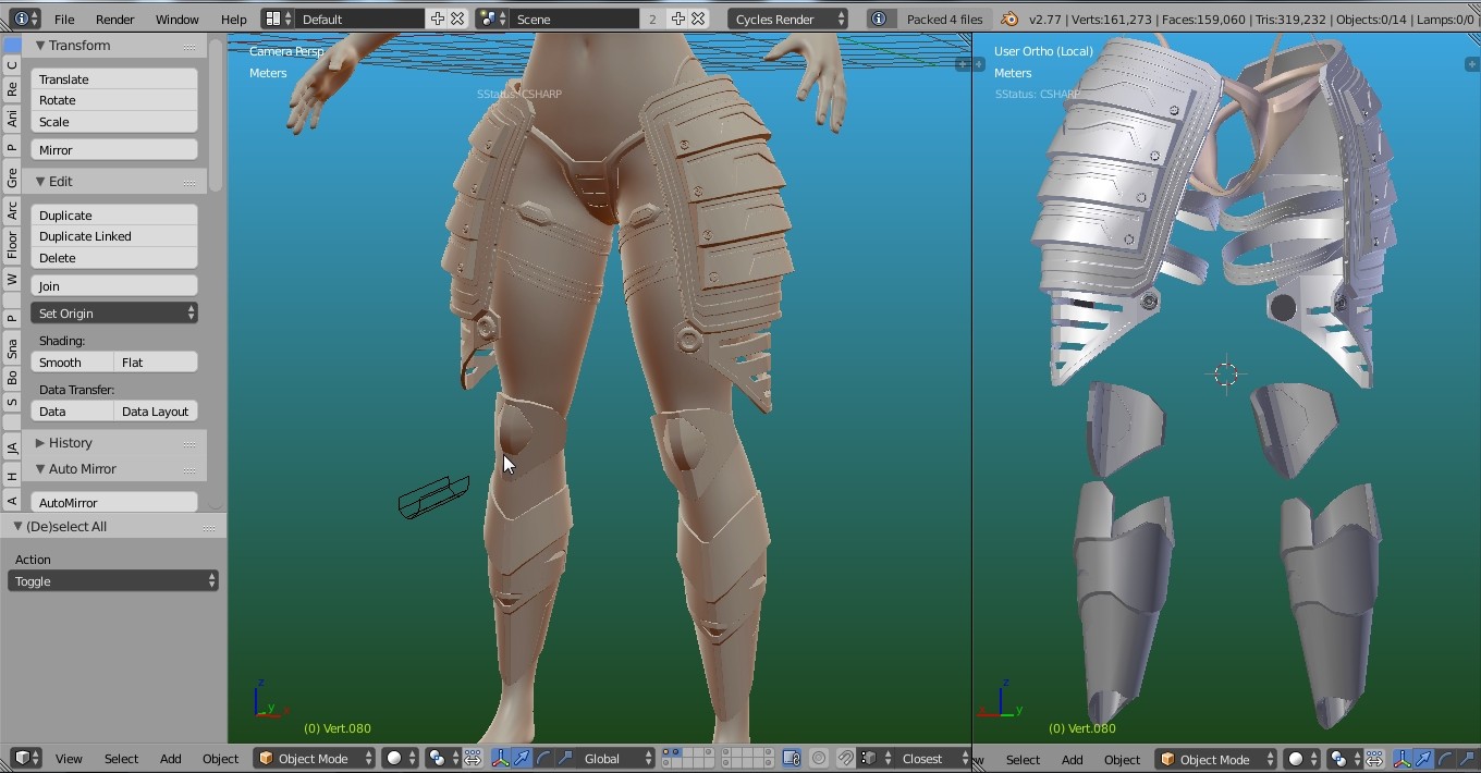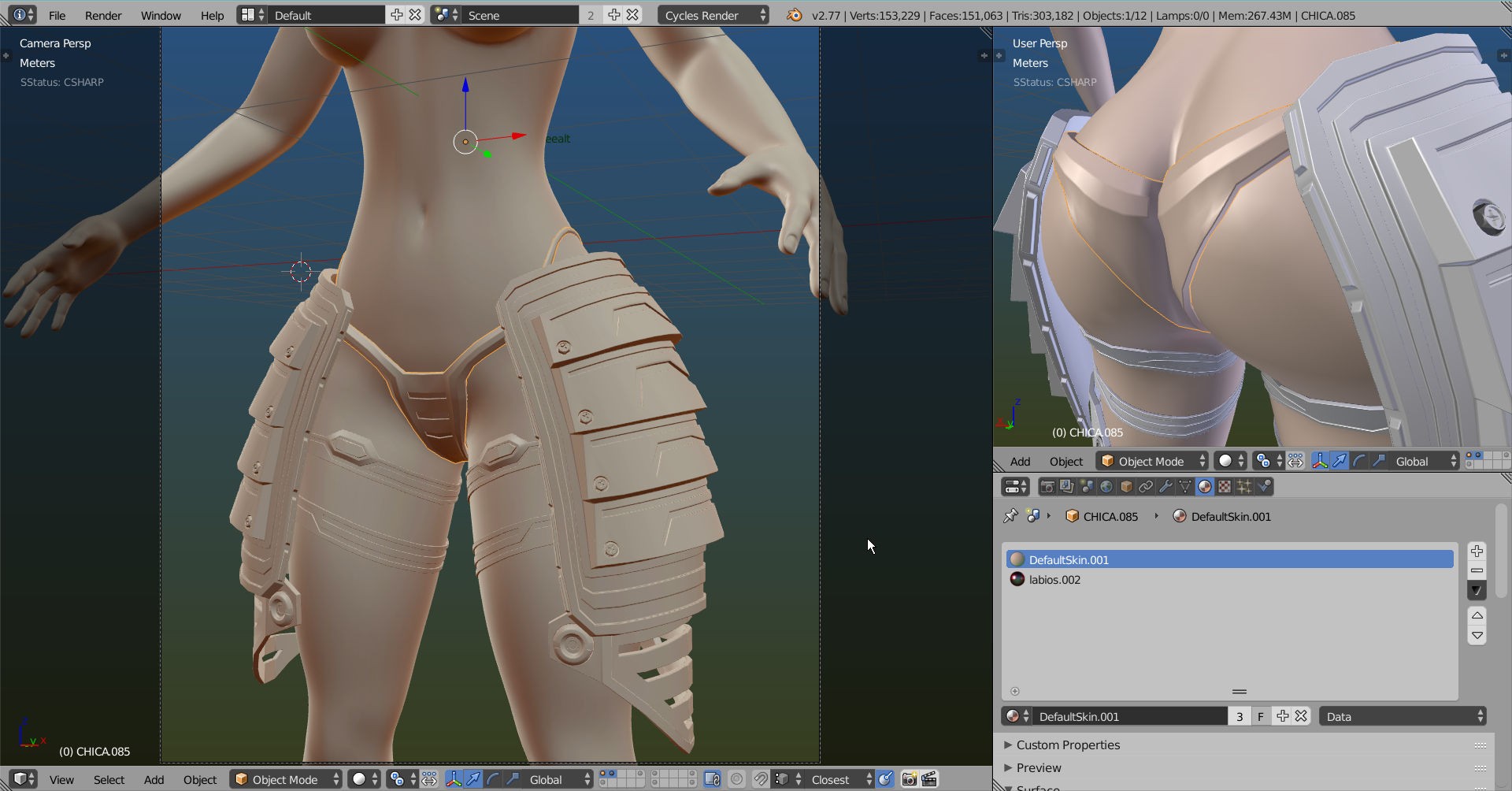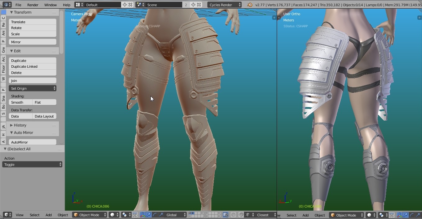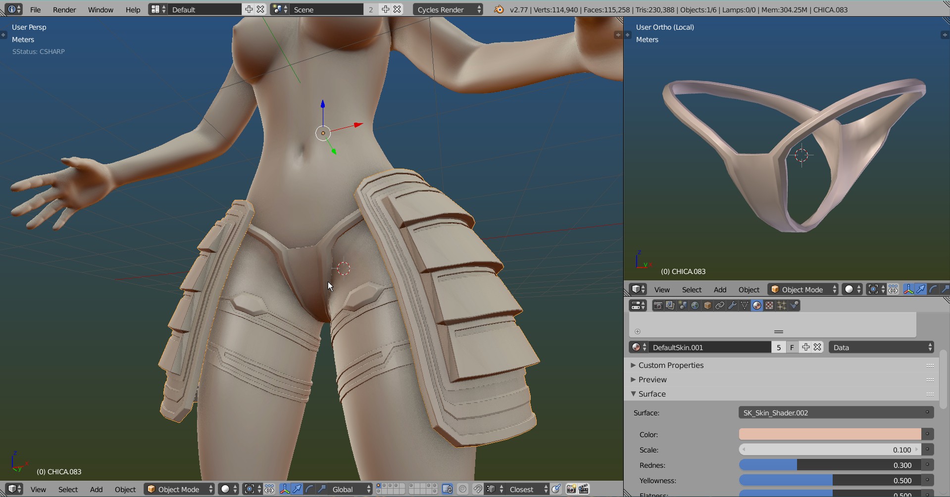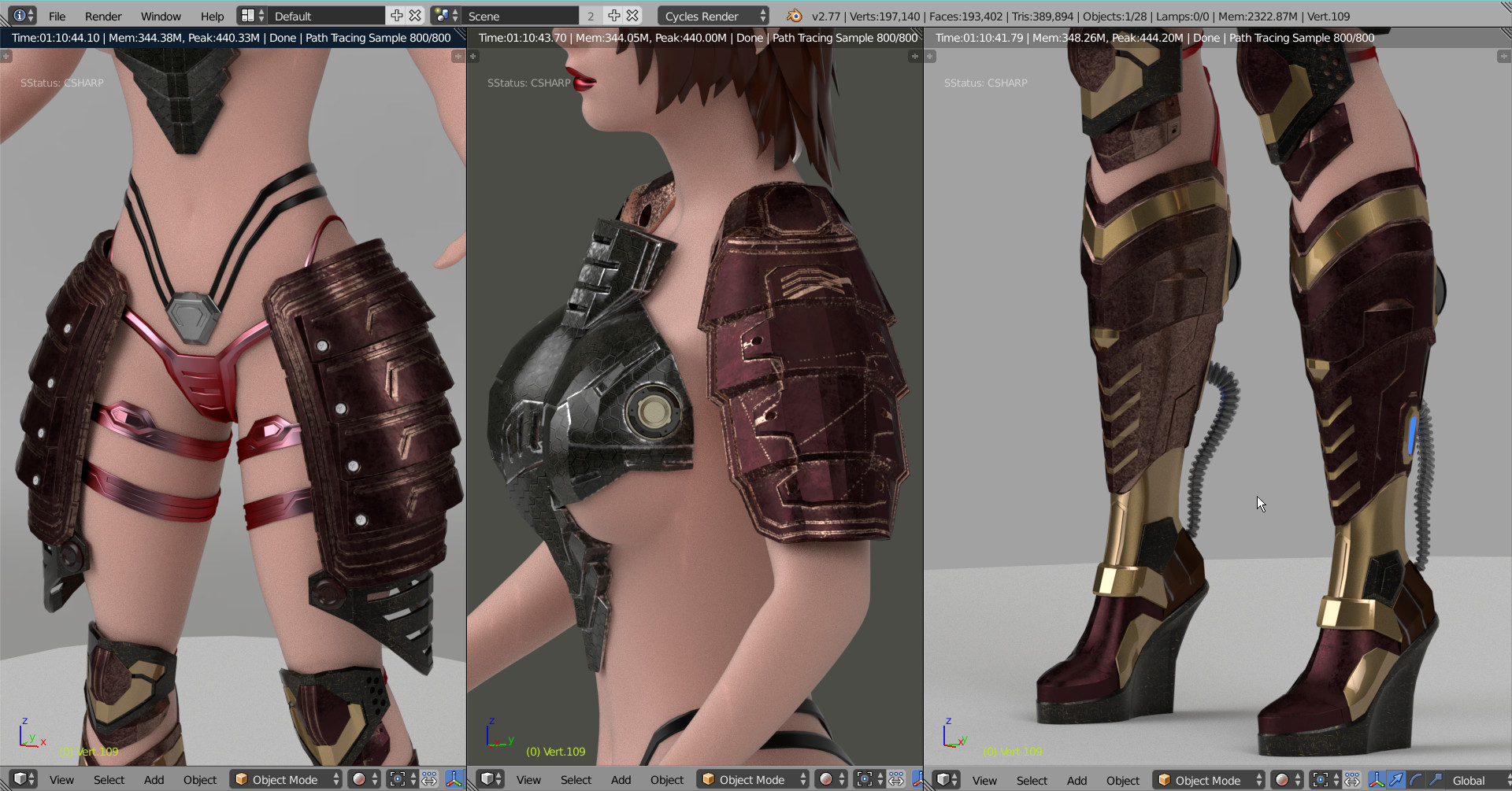Hola a todos, hace algunos días comencé a modelar esta chica en los pequeños tiempos libres que tengo, la base femenina está en MakeHuman, luego algunos retoques con Blender para lograr las caderas y los pechos a mi gusto más otros retoques. Y a modelar la armadura.