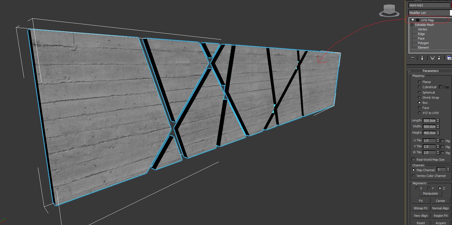 Estoy empezando con los muros. Los muros tienen una textura de hormigón con un modificador UVW map.