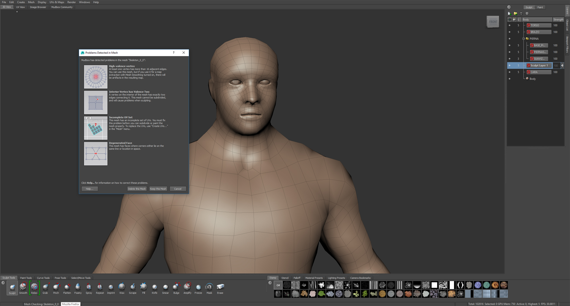Vas a tener que abrir tu geometría base en max o lo que vengas usando, y revisar no tengas vértices intermedios en las aristas. (vértices huérfanos, etc) Estos suelen estar a veces en el eje simétrico, al usar, por ejemplo, el modificador symmetry, no cierra bien, y se quedan pululando por ahí, también en la zona del ojo, entrepierna y comisura, boca, son zonas conflictivas. Mira qué tus uvs, están completas, vamos, tu modelo mapeado, sin caras solapándose, aunque si ya tienes problemas de geometría, es lógico estas mismas zonas, den error al hacer las UVS. Luego quedaría, que no tengas vértices donde convergen muchas aristas (más de 16), estos son llamados vértices de alta equivalencia. (Quizá tienes este problema si usas esferas, no quads, como en los ojos) punta de los dedos. U otros objetos, he visto una especie de objeto/esqueleto en tu escena, ¿Qué igual no debería estar hay? Y por último vértices cruzados (los llama degenerated faces) estos últimos también Mudbox los reconoce como problema de UVS. Ya qué no puede proyectar, por ejemplo, el pintado.