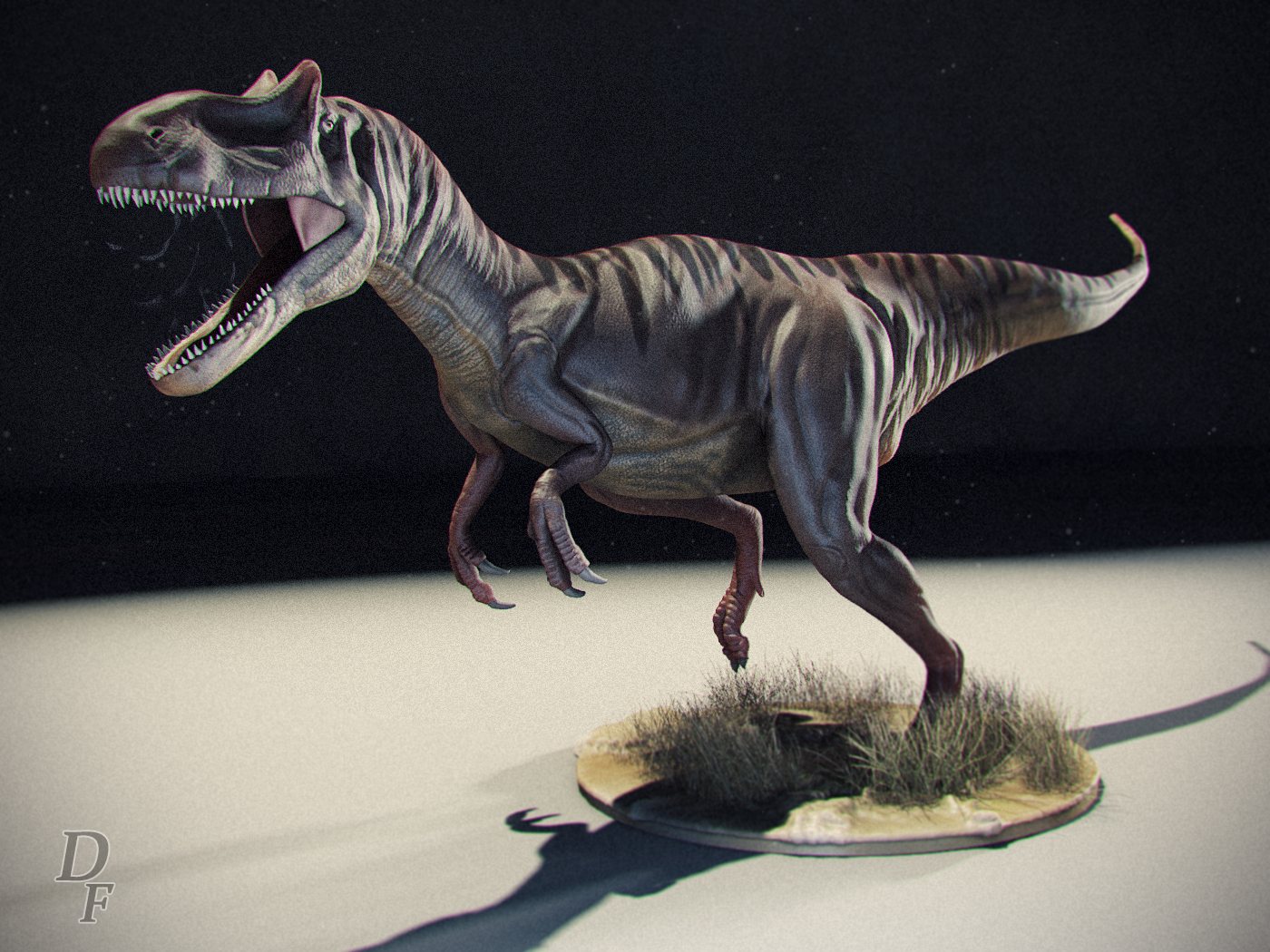 Muy bueno el proceso y el resultado. Quizá bajaría el S del material y trabajaría la anatomía. He hecho un paintover(espero que no te moleste) con algunas sugerencias. La más importante para mí es la posición de las manos, que es un error bastante común sobre todo porque estamos acostumbrados a películas como Jurassic Park. La posición de las manos era paralela al cuerpo y no mirando hacia atrás, ya que las muñecas estarían dislocadas en esa posición. Espero que te sea de ayuda.