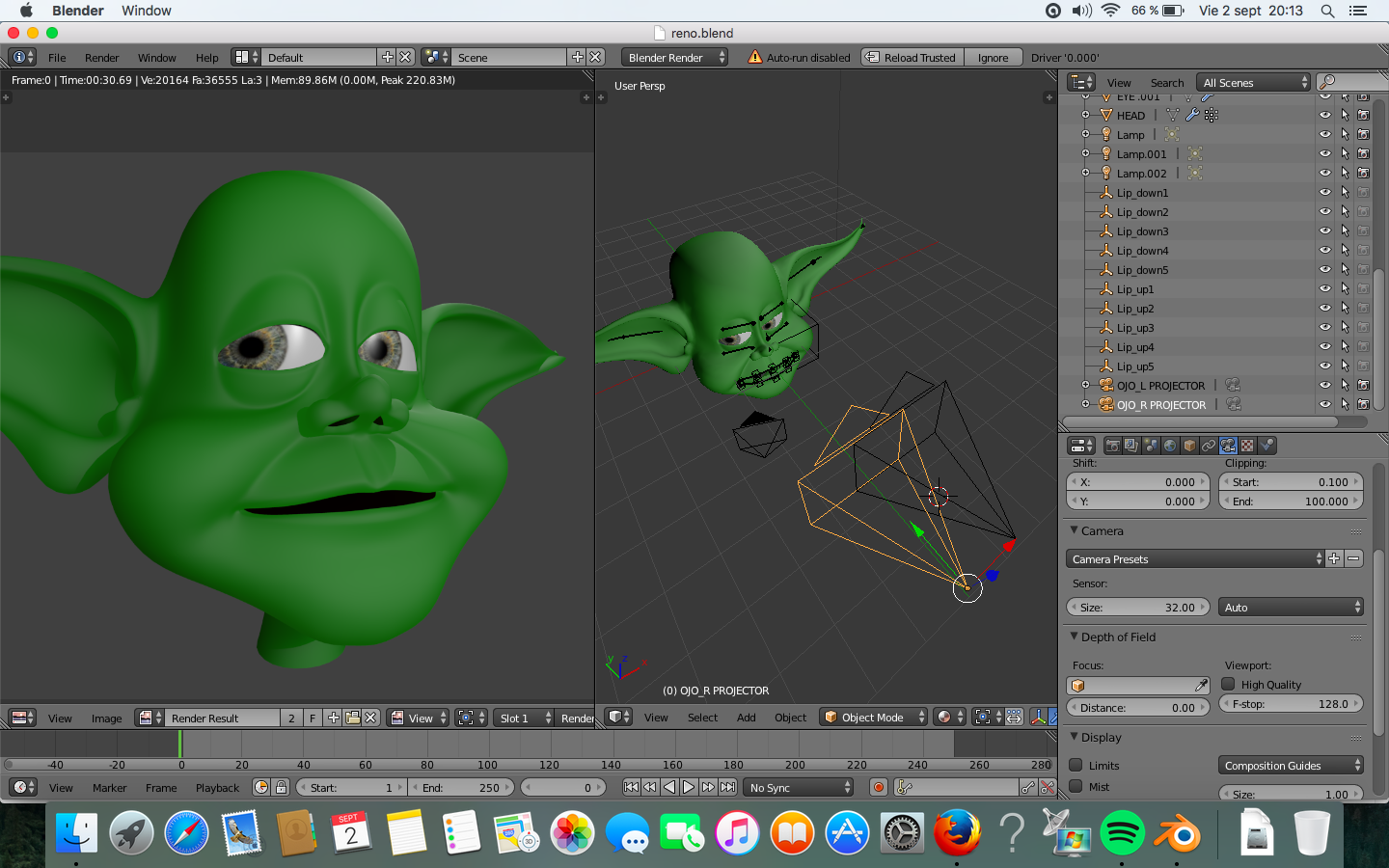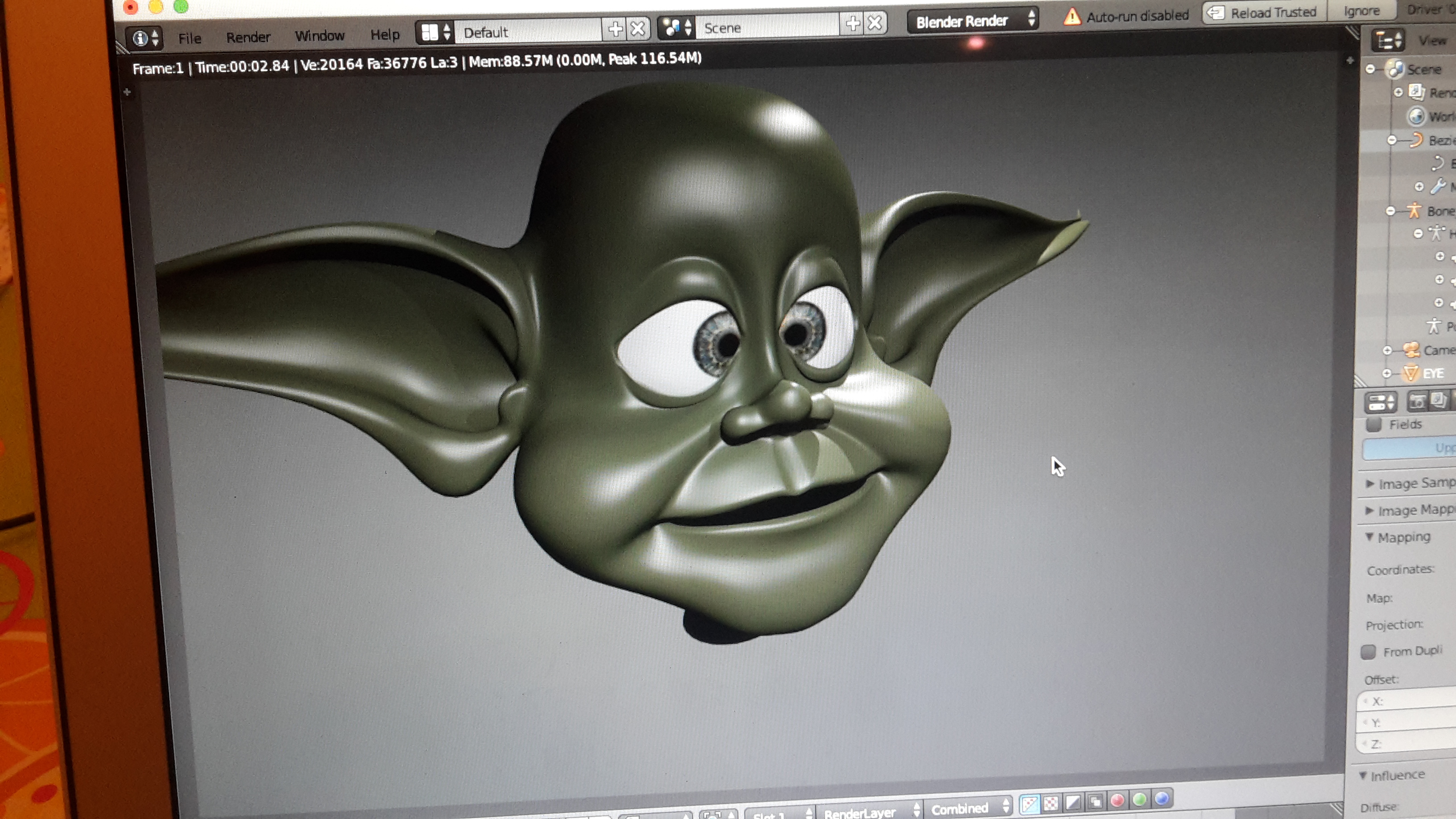 Buenas. Ahí dejo la imagen, al final salió y queda perfecto, aunque no sea esférico. Utilicé dos cámaras que proyectan la textura del ojo y luego he hecho un parent de las cámaras a los ojos para cuando mueva la cabeza, las cámaras sigan mirando a los ojos como decías. Muchas gracias funciona de lujo, seguiré manadando aquí las dudas que vaya teniendo y el proceso del proyecto. Gracias mil. Un saludo.