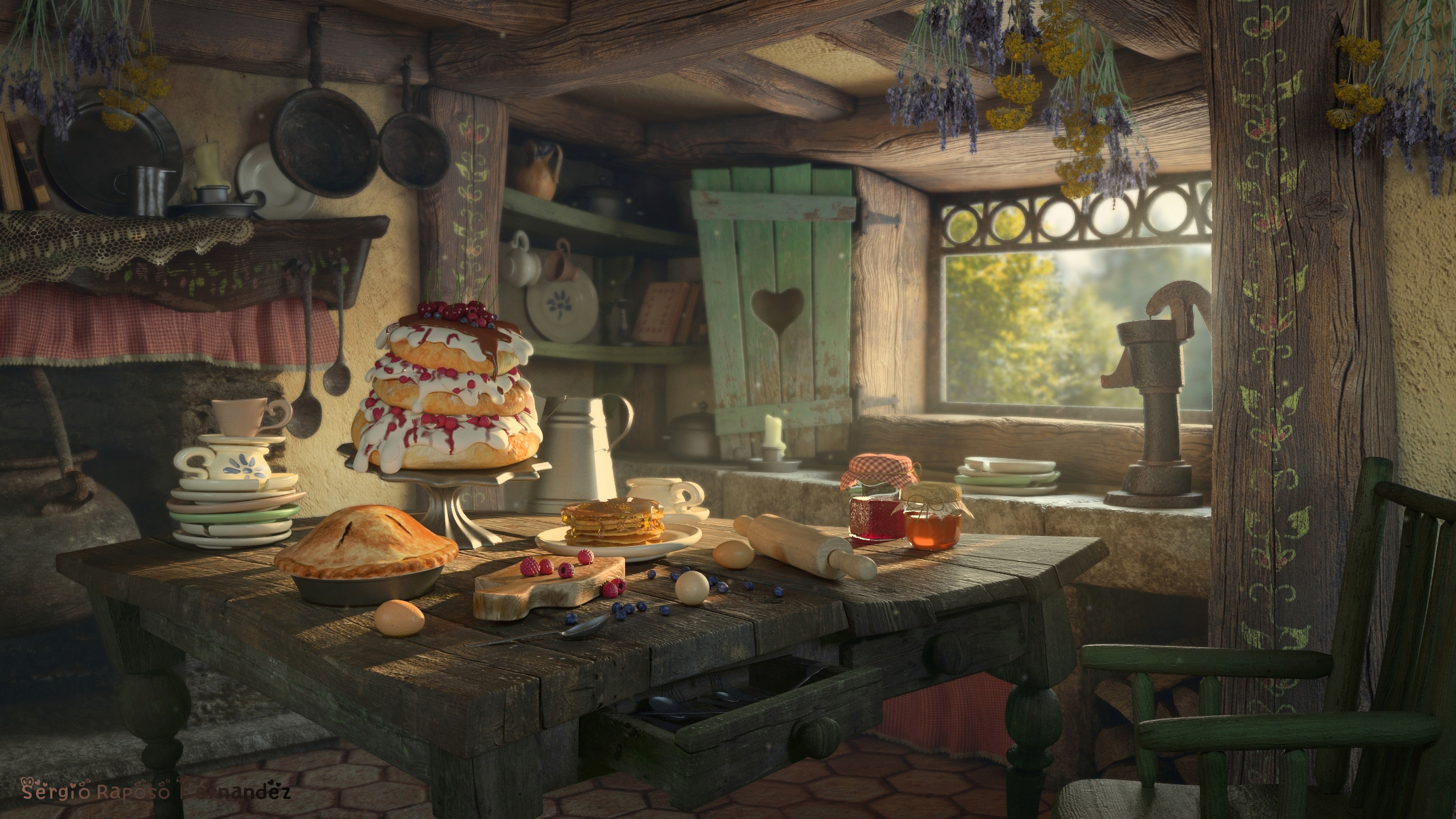 Se trata de una escena inspirada en el cuento de Hansel y Gretel. Quise recrear el interior acogedor y cálido de una cottage de estilo Tudor.