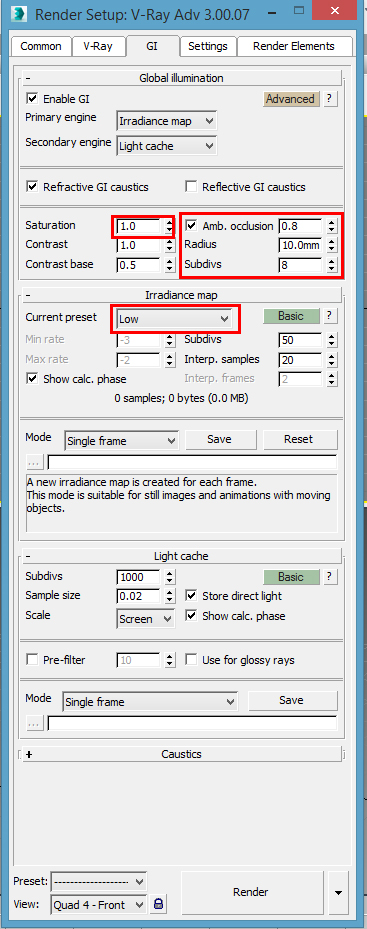 La escena onsta de 2 luces Vray planas en las ventanas con un valor de 30, en el interior de la escena he puesto unas Vray esféricas para simular unos focos con un valor multiplicador de 100, shuter speed 100