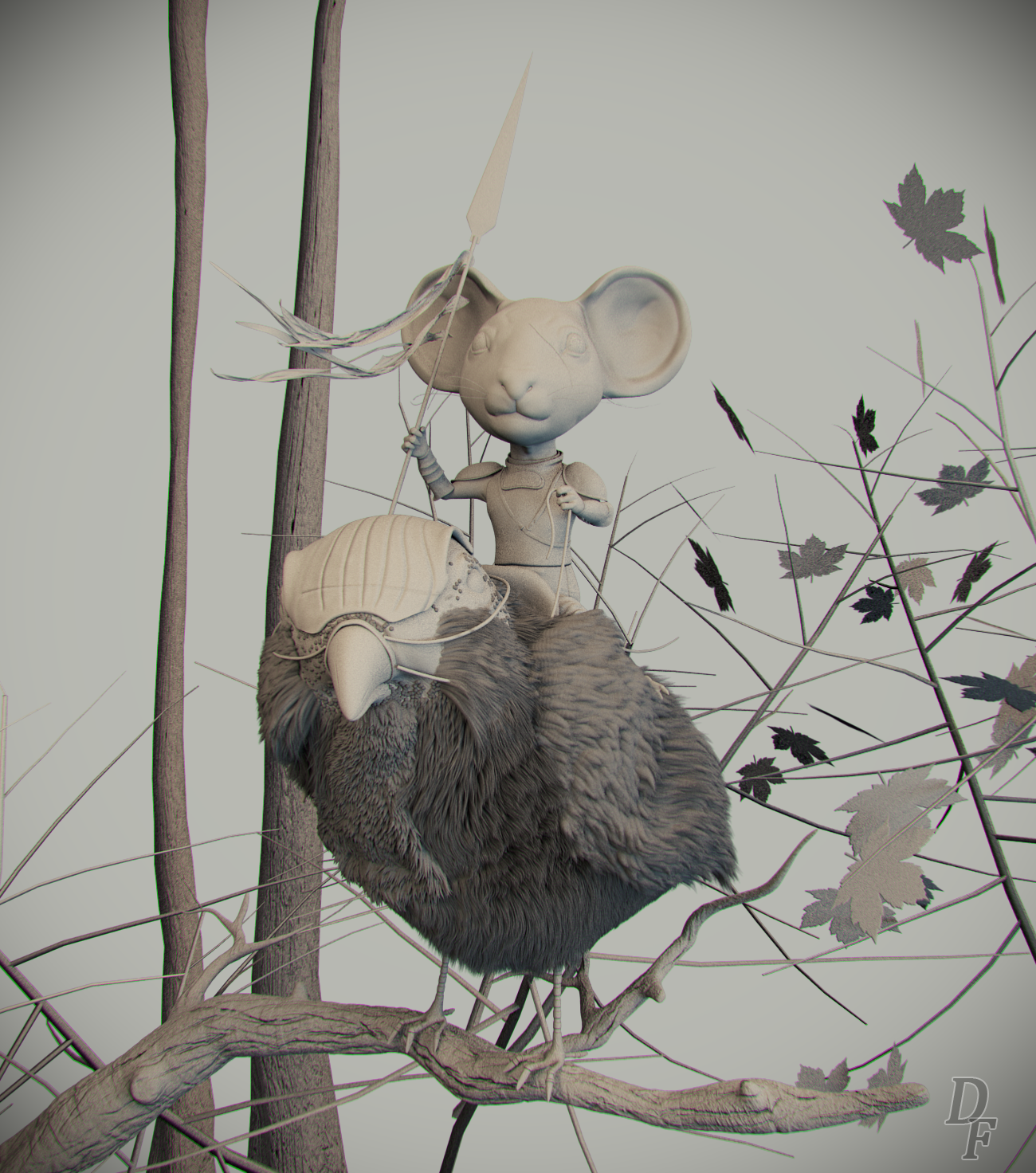 Muchas gracias Sergio, pues tienes toda la razón y la verdad que no me di cuenta de poner algo de flexión a las hojas, un despiste de esos tontos, y, aunque mi intención no era renovarlo, pero me vi obligado a poner ciertas cosas a mi modo de interpretación, el concept original si te das cuenta los 2 personajes están como muy lejos y la lanza del ratón es inmensa, y no me cuadraba en la cámara además de que no se apreciaría el trabajo de estos en mí versión, el tipo de acabado como de ilustración no le he mencionado, pero ha sido con el software Topaz de Photoshop después de hacer la composición con Nukex, recomiendo esa herramienta muchísimo para los renders estáticos, saludos compi y gracias.