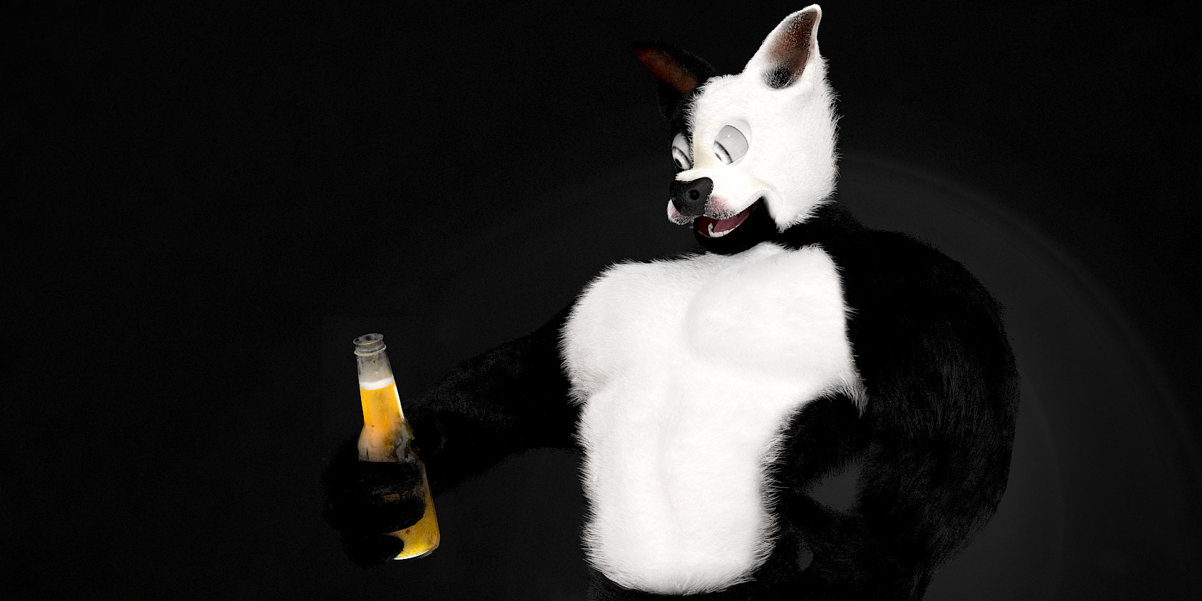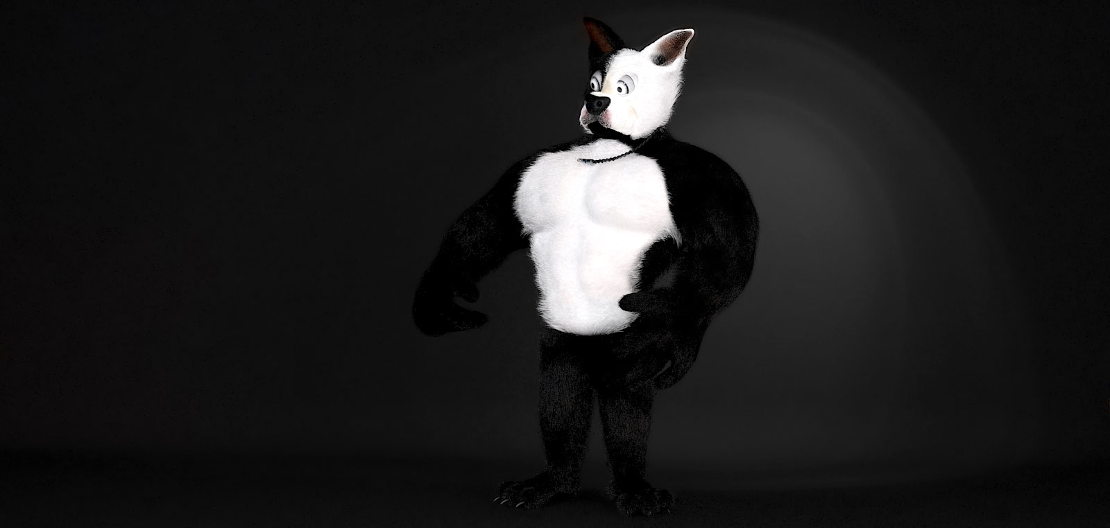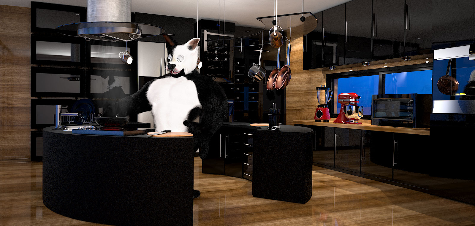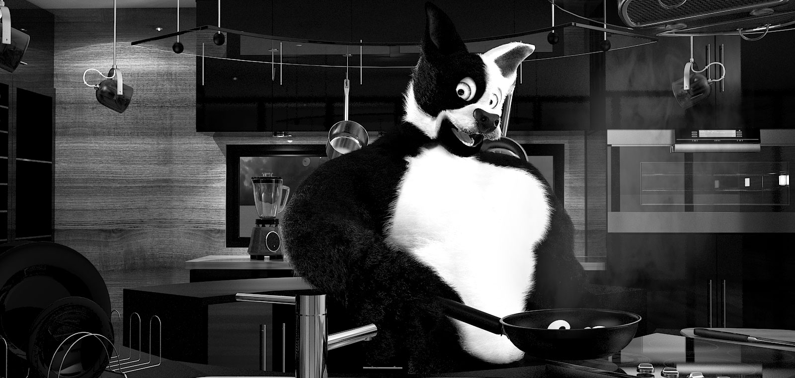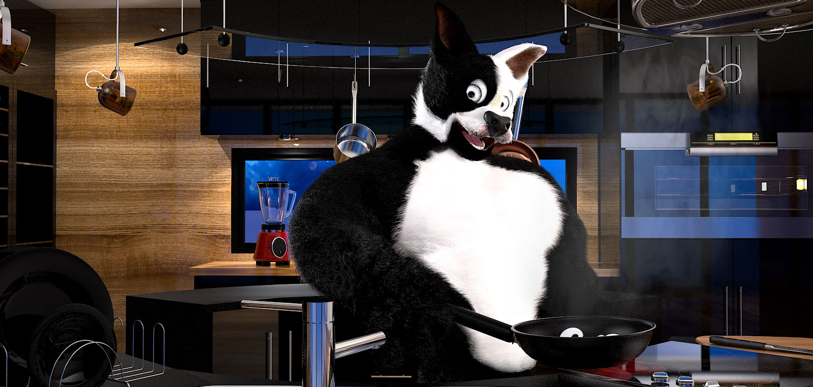 Pol es un perro antropomorfo de raza Boston Terrier. La cocina es de un estilo contemporáneo con influencia de minimalismo.