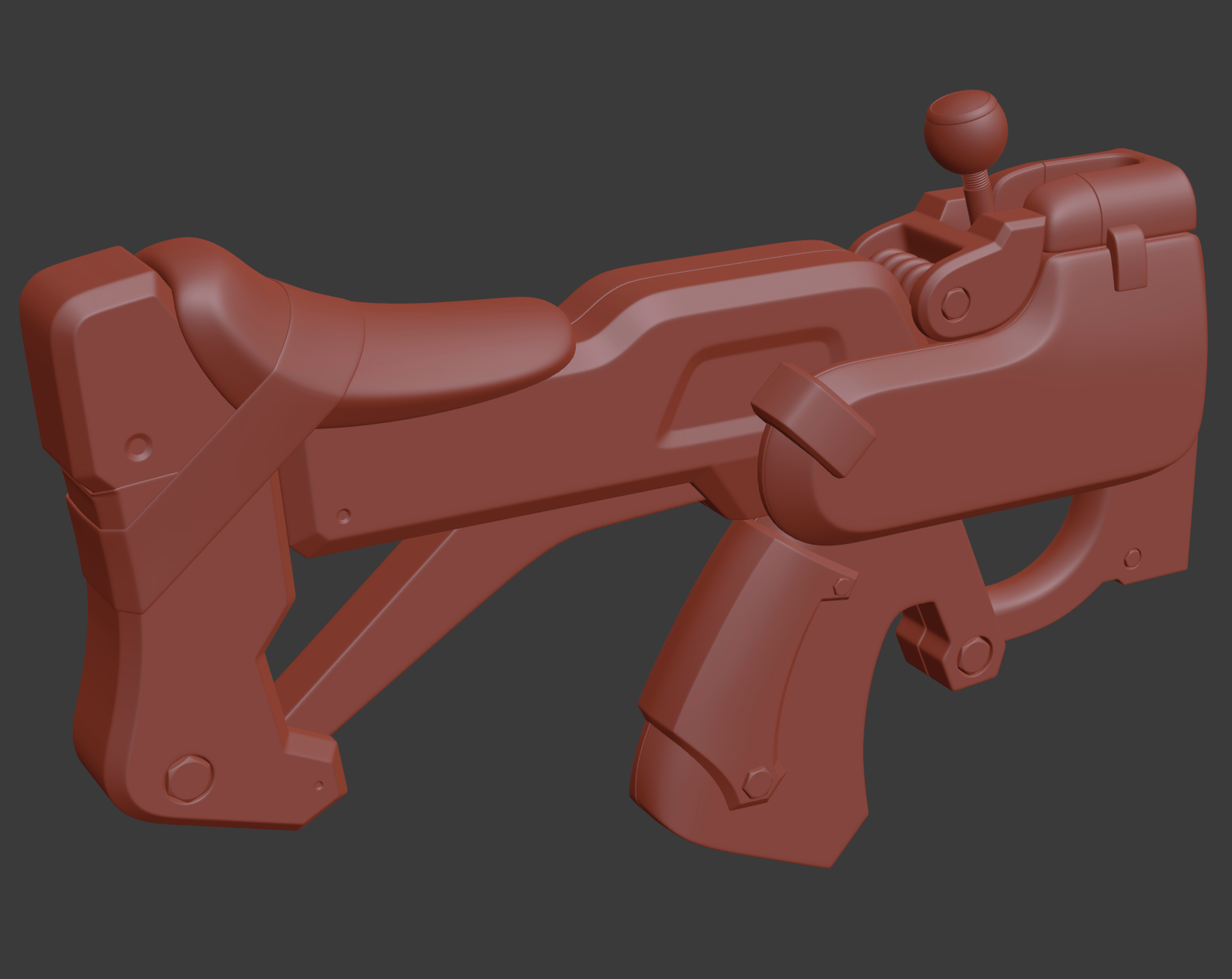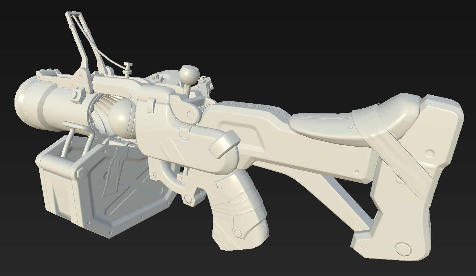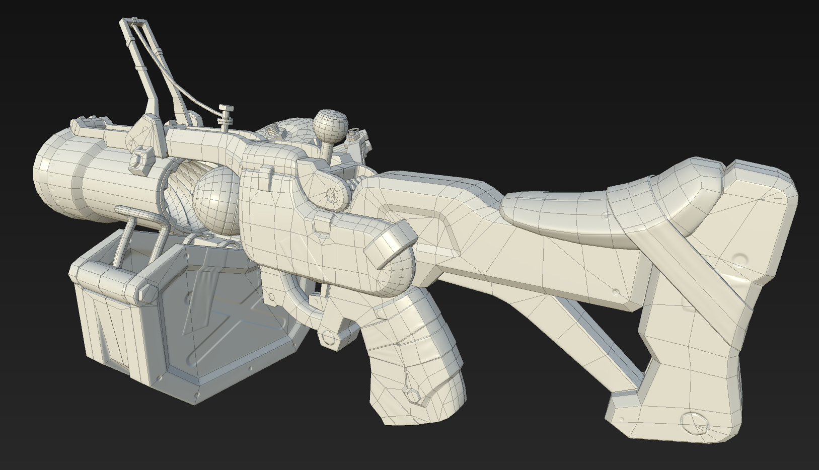 Proseguimos con el retopo: ya tenemos el cuerpo del arma, a falta de un par de piezas que hemos dejado para después del Unwrap ya que son asimétricas. La semana que viene continuaremos con las demás piezas y los detalles.