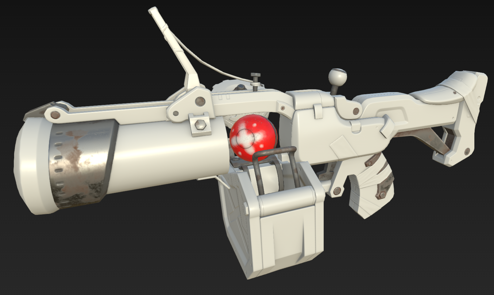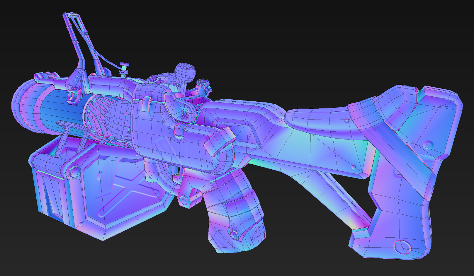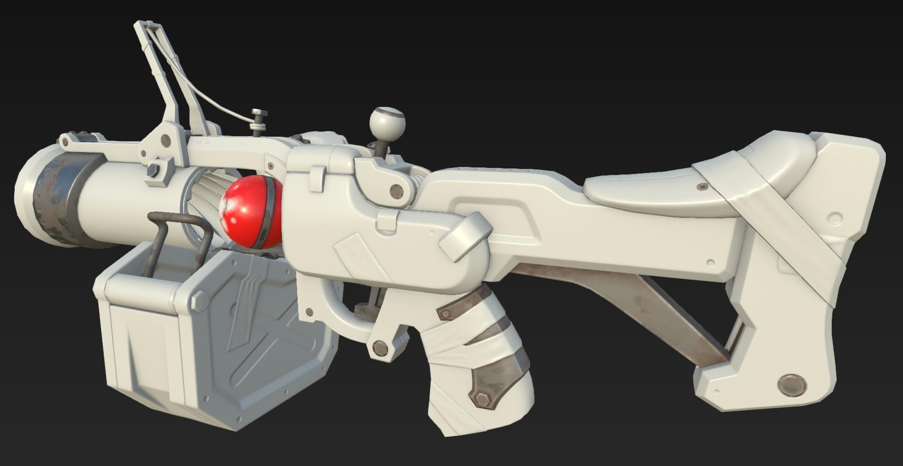 Normalmente al cambiar el modelo de alta se modifica luego el retopología, UVS y se queman de nuevo los mapas. En este caso, como los cambios apenas afectaban a la forma (ya qué las cintas están pegadas a la superficie) no hice cambios en la malla de baja ni en las UVS (lo que podría haber originado la necesidad de hacer más cambios en la textura en Substance), sino que solo volví a quemar los mapas Si fueran cambios mayores que modificasen la forma esencial del modelo, ahí sí que habría que retocar también el modelo en baja resolución. Por eso se hace el modelo de baja cuando el de alta está finalizado y sabemos que no vamos a volver atrás. Simplemente en este caso se me había pasado por completo romper las cintas y luego no quedaba bien el arma toda machacada y las cintas perfectas.