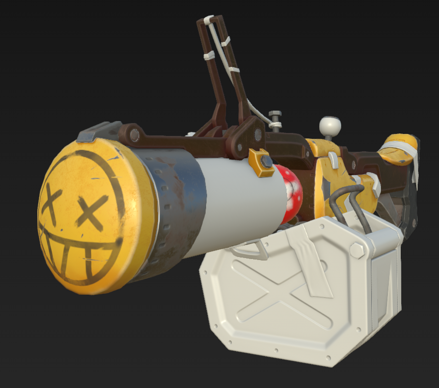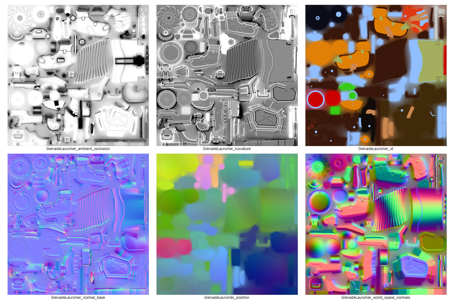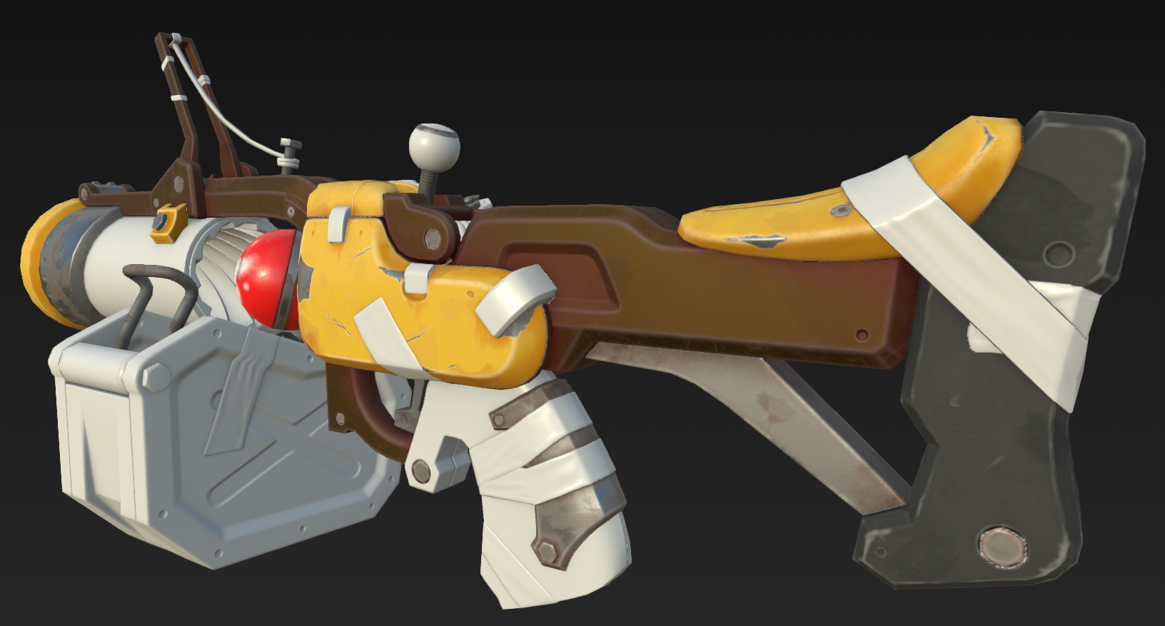 Normalmente al cambiar el modelo de alta se modifica luego el retopología, UVS y se queman de nuevo los mapas. En este caso, como los cambios apenas afectaban a la forma (ya qué las cintas están pegadas a la superficie) no hice cambios en la malla de baja ni en las UVS (lo que podría haber originado la necesidad de hacer más cambios en la textura en Substance), sino que solo volví a quemar los mapas Si fueran cambios mayores que modificasen la forma esencial del modelo, ahí sí que habría que retocar también el modelo en baja resolución. Por eso se hace el modelo de baja cuando el de alta está finalizado y sabemos que no vamos a volver atrás. Simplemente en este caso se me había pasado por completo romper las cintas y luego no quedaba bien el arma toda machacada y las cintas perfectas.
