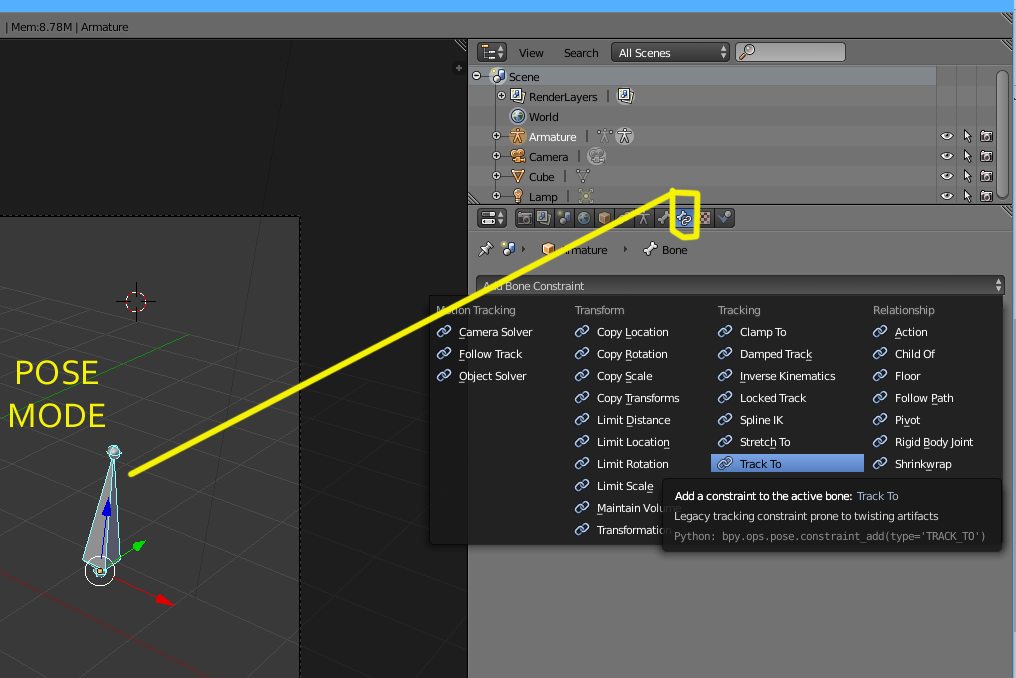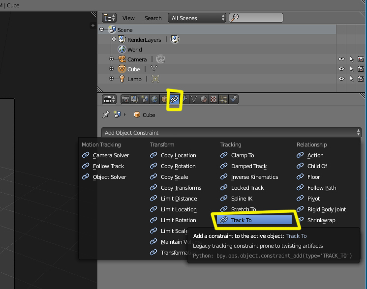 Tengo Blender 2.76, no encuentro la restricción Seguir a. (Track To.) No está en el panel de Restricciones ni la encuentro en: Modo Objeto > Objeto > Rastrear ni en Ctrl+T.