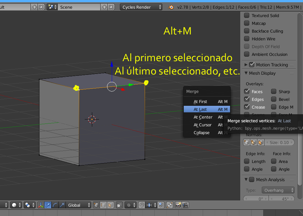 Primero colocar el cursor en la posición del vértice con Cursor a la Selección (Cursor to Selected)