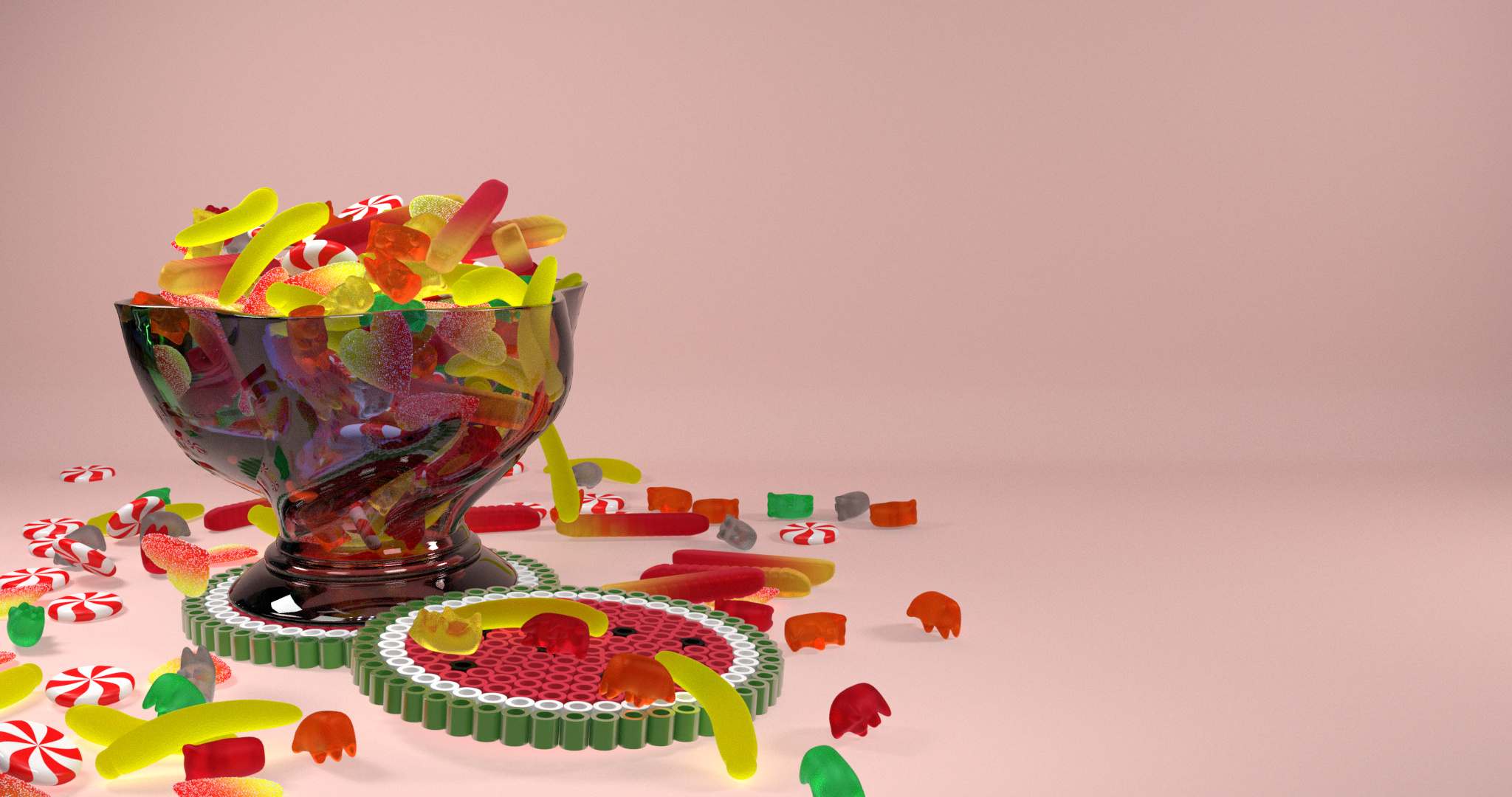 Pero hay cosas que no me convencían mucho y una de ellas era el material de gominola en sí mismo. Las físicas tampoco me convencían mucho y, de hecho, he terminado por no hacer animación. No pretendía hacer lo mismo que ya se ha visto, pero al final ha sido otro render genérico más. No estoy orgulloso de este trabajo, la verdad.