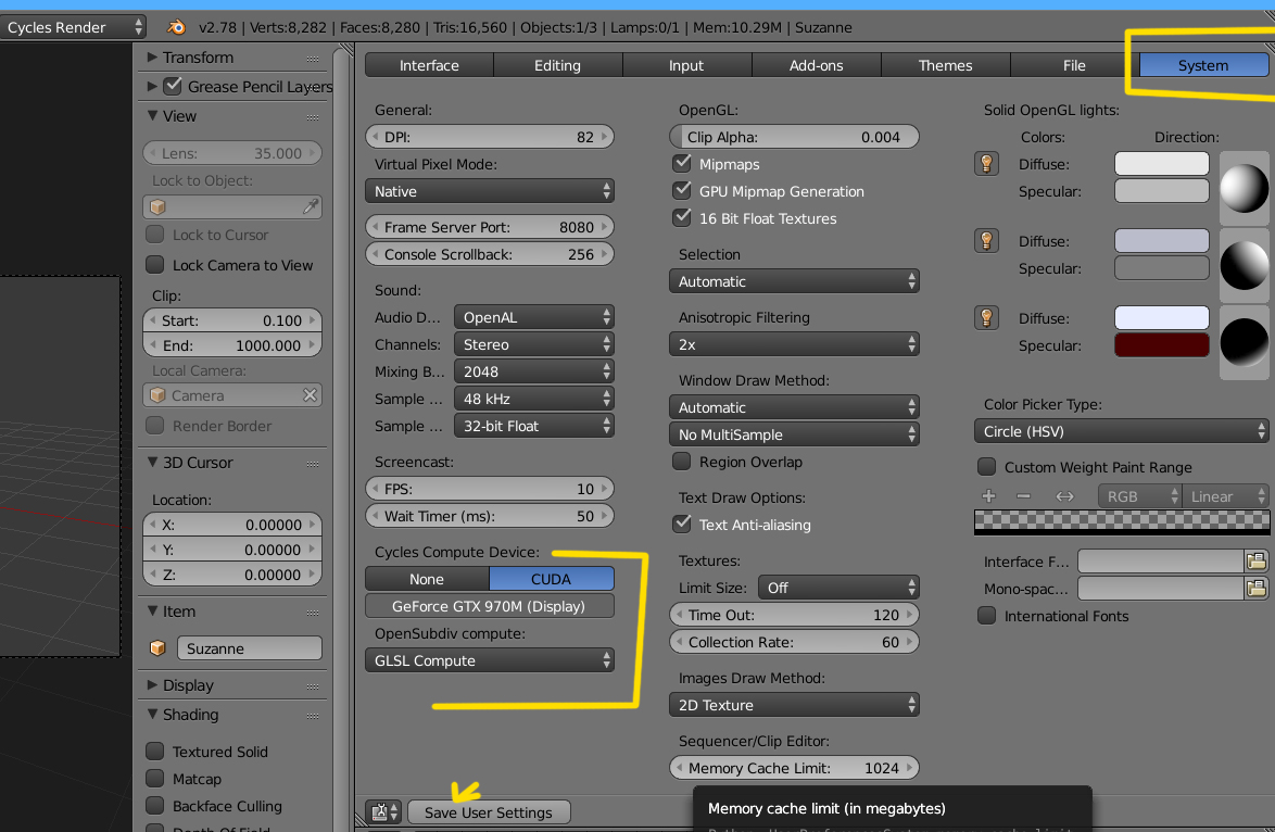 Si haces cambios, recuerda salvar (Save User Settings).