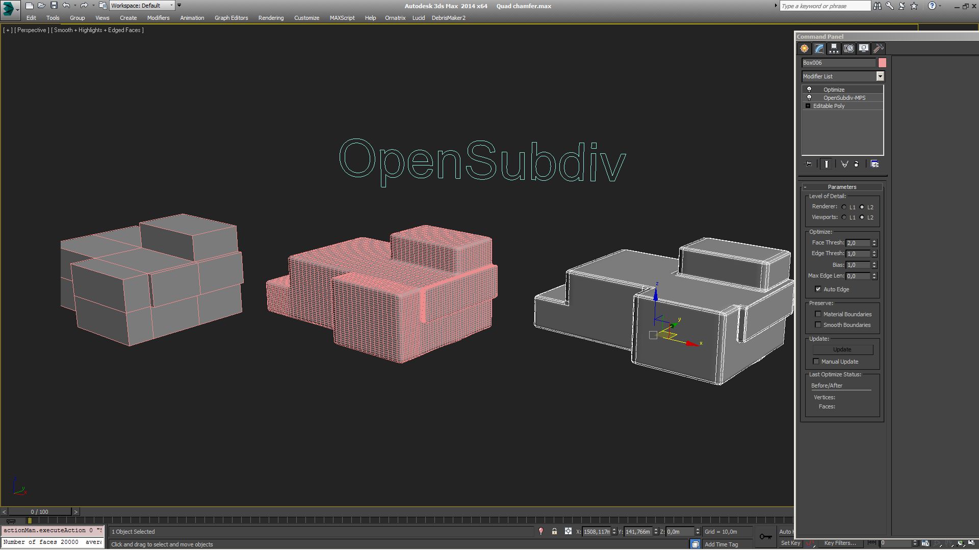 Para este proceso necesitamos dos etapas, la primera es la aplicación de Opensubdiv el cual subdividirá completamente la malla tal como si se tratase del modificador Smooth, pero con la salvedad de que postura un parámetro llamado Edge Crease el cual restringe la redondez a un radio cercano a las aristas de la geometría, el radio se ajusta con el sub parámetro Override, lo cual genera exactamente un efecto chamfer.