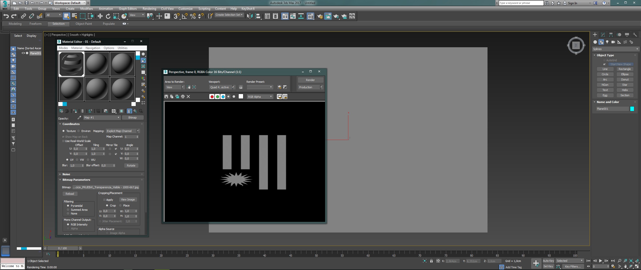 Para hacer la parte transparente, en Adobe Photoshop tienes que hacer la misma imagen en blanco y negro. Negro en la zona transparente y blanco en la visible (Si hay gris será medio transparente). Una vez tengas la imagen, la pones como bitmap en el canal de opacity de 3ds Max y ya debería verse transparente.