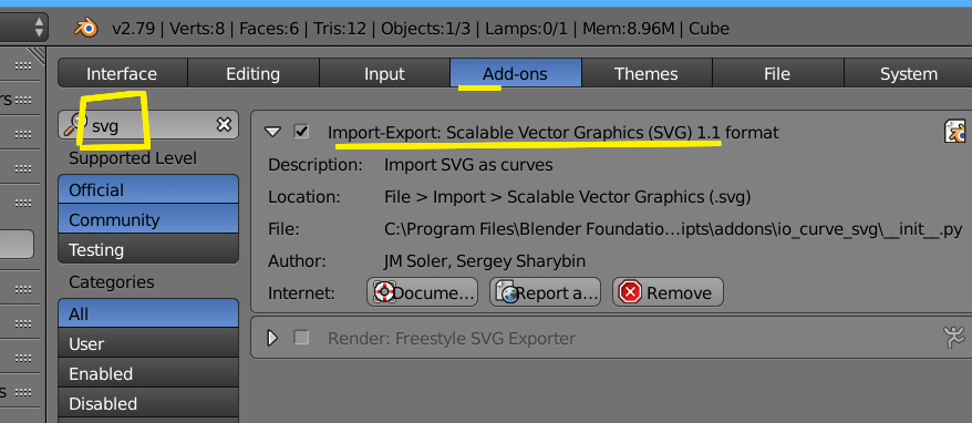 Hola buenas alguien sabe cómo solucionar el error al importar un archivo.svg en Blender, activé la casilla add-ons import/export svg, reinstalé Blender 2.78 ,2.79 pero aún continúa el error traceback (most recent call last).