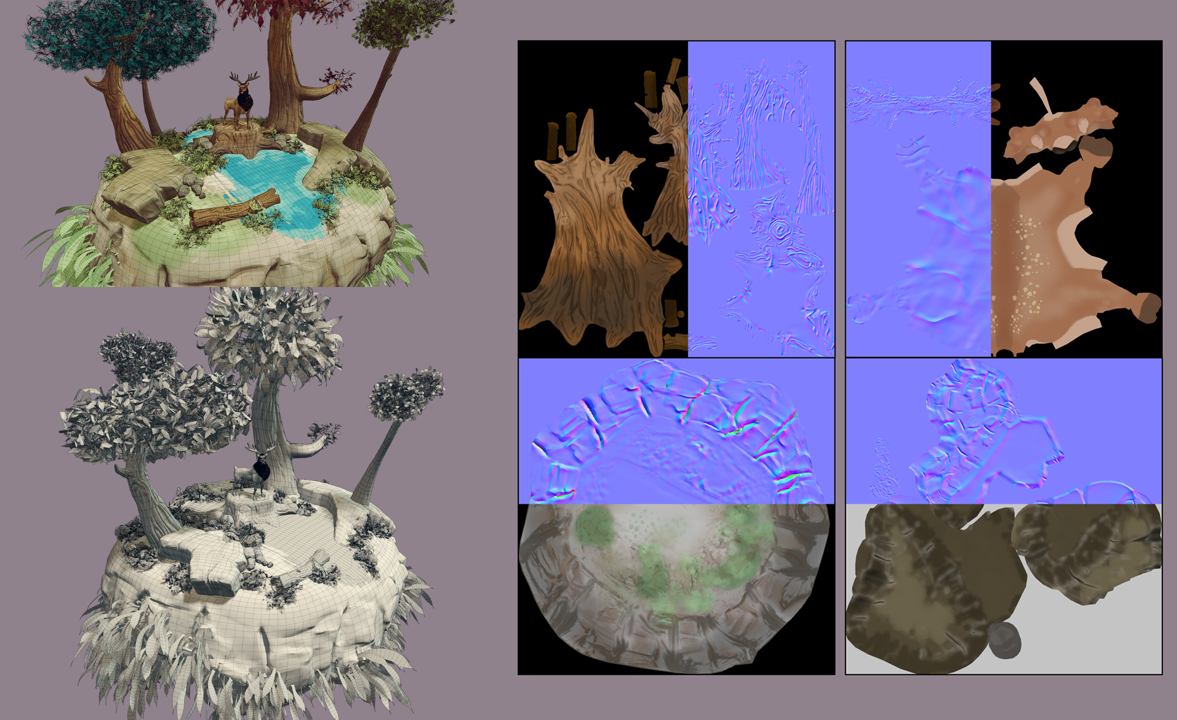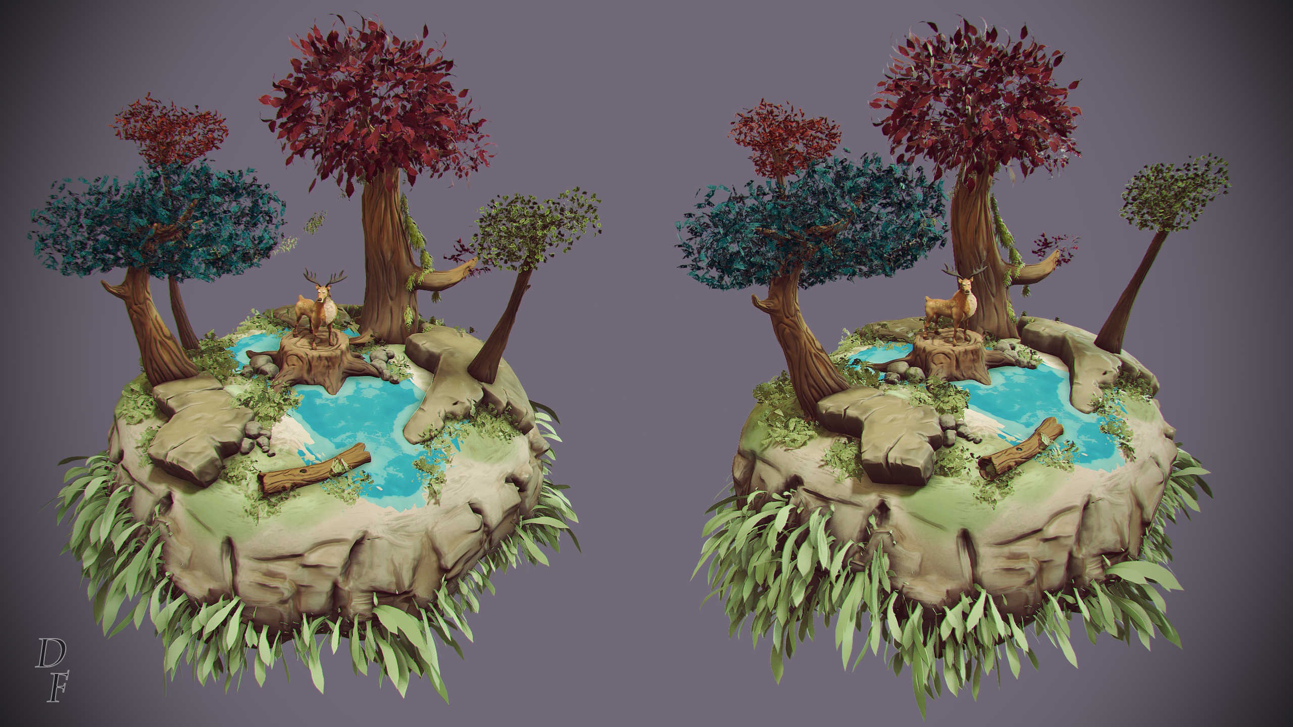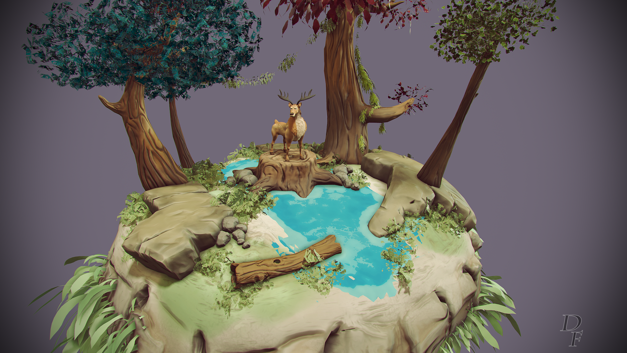 Saludos, comparto con vosotros un proyecto que andaba terminando y tenía ganas de una temática de naturaleza cartoon en diorama, el modelo es más enfocado a videojuego renderizado en real-time con Marmoset.