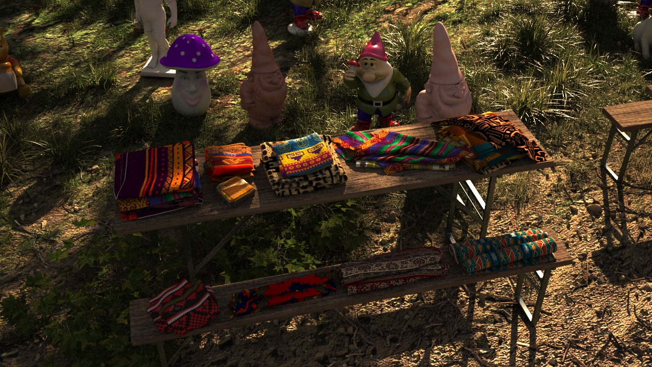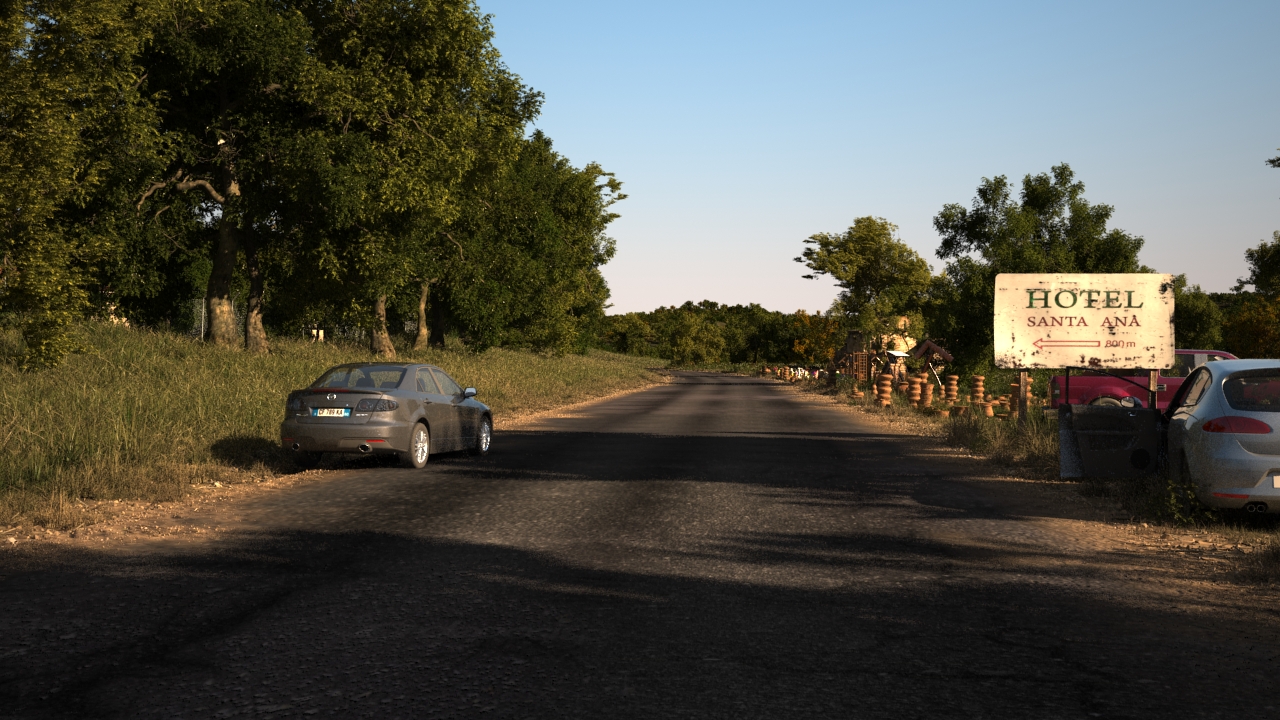La escena contiene unos 3 mil millones de polígonos, ya que las piedritas y palitos en la banquina son geometría y se extienden por toda la ruta sin someterse a LOD (level of detail), y lo mismo aplica para él pasto, arbustos y árboles en toda la escena.