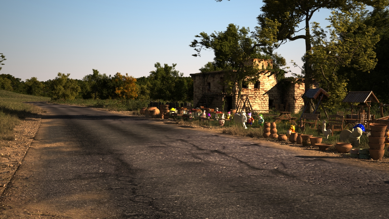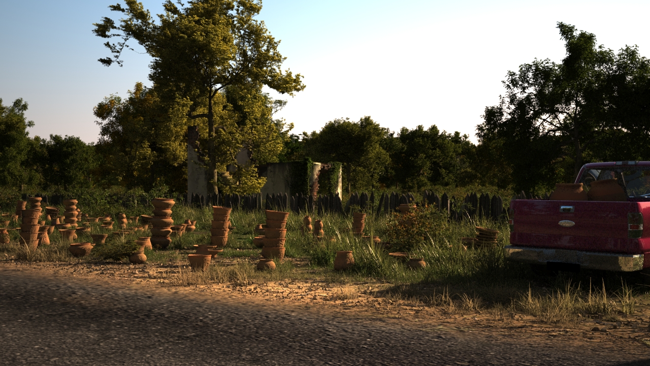 También usé Vray distance texture con multiscatter para manejar la vitalidad de la vegetación en torno a la ruta y hacia dentro del campo tras la valla. Dicha valla es un preset propio que he creado en Railclone.