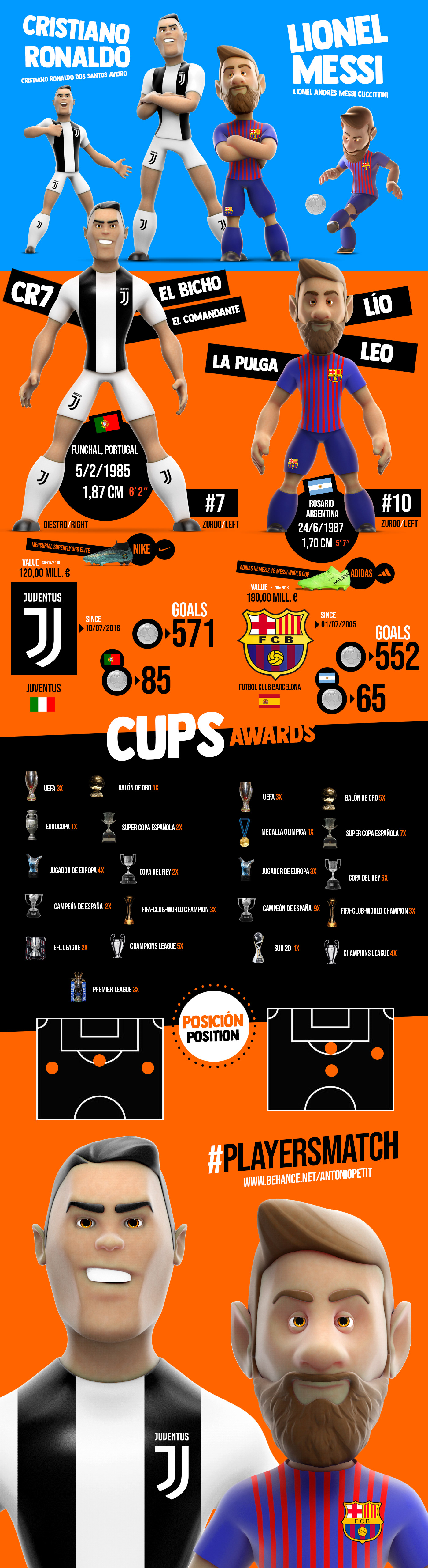 Dos infografías comparativas de Maradona/Pelé y Cristiano Ronaldo/Messi realizadas en ZBrush, KeyShot y Adobe Photoshop, espero que les guste.