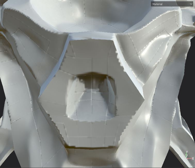 Como dije en el titulo estoy intentando hacer un bake del modelo en alta sobre la retopología en baja. Al hacerlo como podéis ver en la imagen, los polígonos de la Maya en baja quedan marcados en el normal map dejando este resultado.