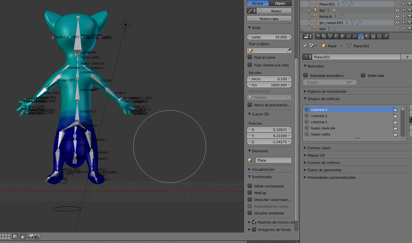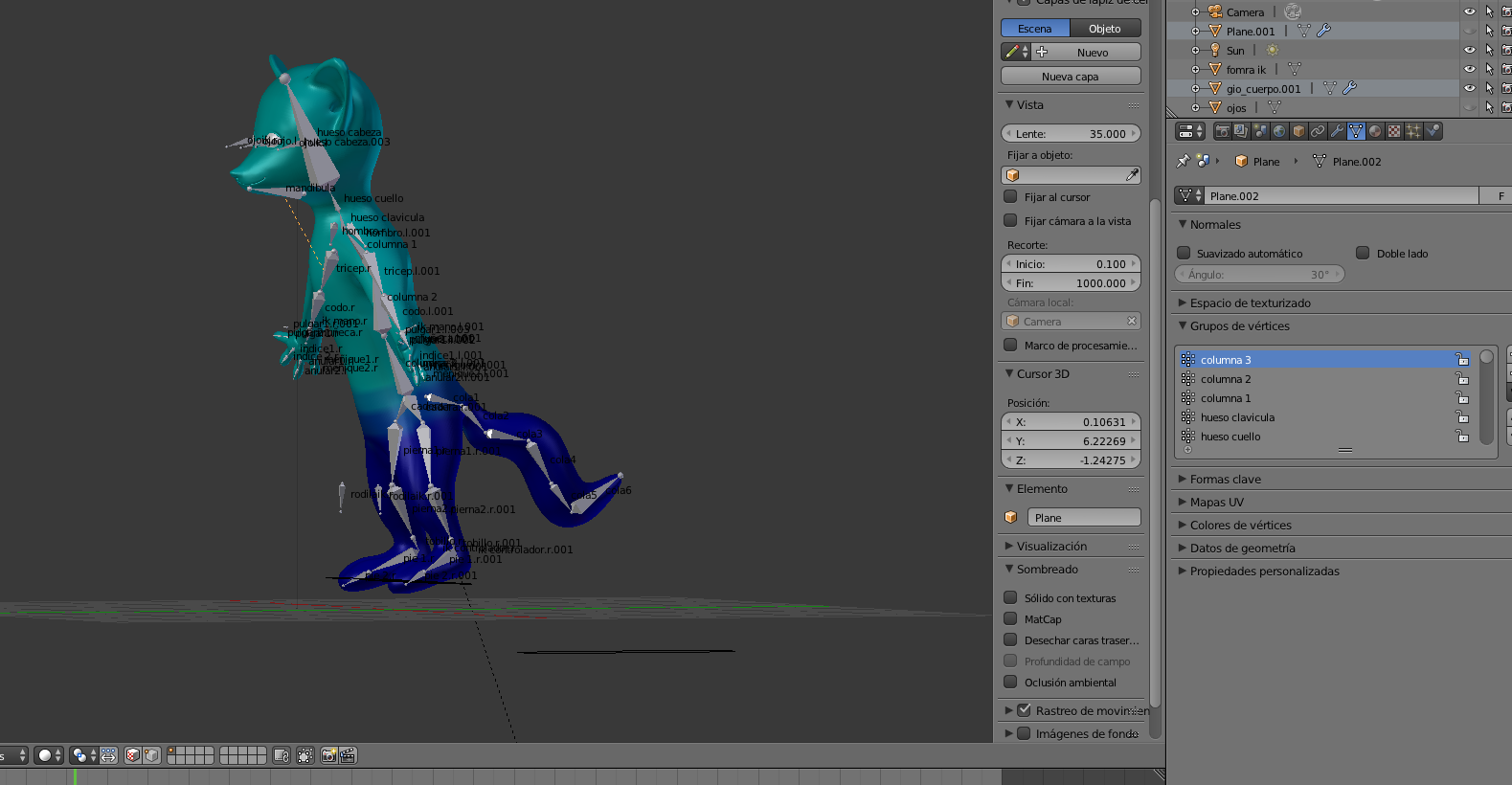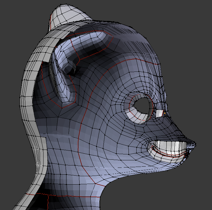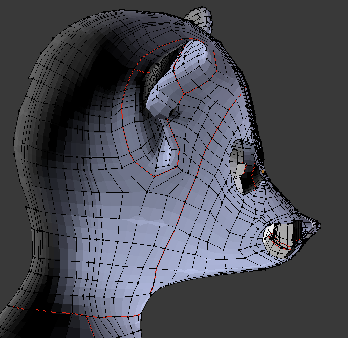 Bueno, mi problema es que tengo el modelo ya realizado y para hacerlo seguí unos tutoriales de John Cuaces (https://www.youtube.com/user/kuaces/videos) del tutorial 7 al 18, pero realmente no continue con el por qué mi modelo es antropomórfico y el utilizaba Rigibody para su modelo y al momento de que lo usara y generara los controladores estos no funcionaban correctamente, entonces busque un tutorial distinto para hacer el rigging de un animal. Pero al momento de pintar las masas del esqueleto que cree estas funcionan de manera extraña porque para qué la cadera se doble hacía adelante tengo que pintar de la cadera para arriba de azul. Y también me di cuenta de que quiero hacer rigging facial para expresiones, pero el tutorial que seguí realizo el rigging facial de una manera sencilla donde solo mueve los ojos y la boca (https://www.youtube.com/watch?v=2Lm1Ukj5mE&t=3263s). También tengo dudas sobre la topología ya que es el primer modelo que he retopologizado y realmente no sé cómo se realizaba la topología de boca y de ojos, lo realice igual al tutorial de John Cuaces.