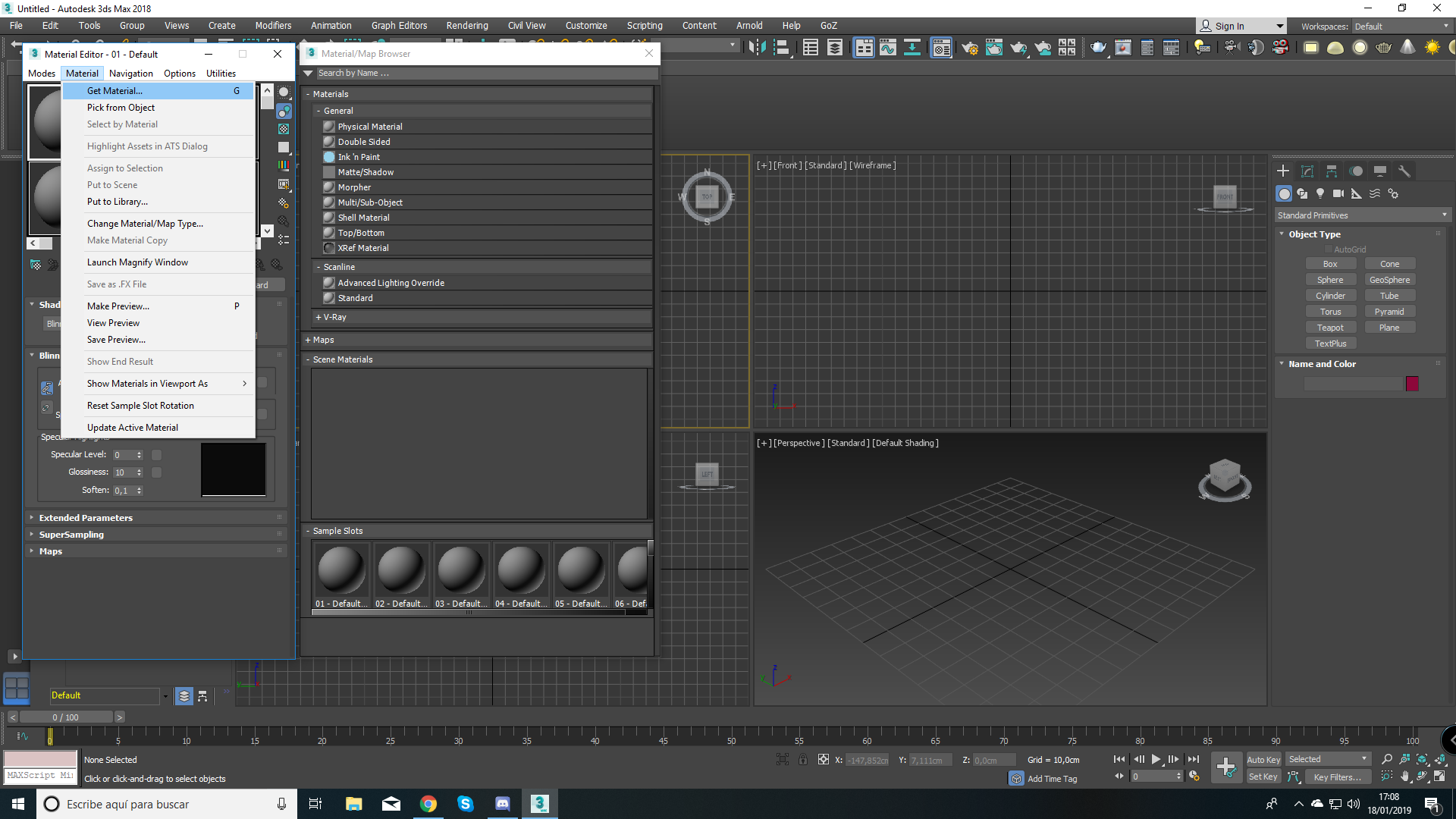 Hola Karras, yo utilizo max 2010, pero no creo que exista mucha diferencia al 2013 en su modo compacto. Cuando le das a get material se abre el buscador de materiales y mapas, puedes buscar los materiales en la librería o clic en scene y te debería aparecer una lista de todos los materiales dé la escena y a qué objetos están asignados. Si esto no sucede es porque algo anda mal en el programa. De todas formas, puedes recurrir al cuentagotas: activas cualquier esfera, activas el cuentagotas (junto al nombre del material), lo sitúas sobre el objeto que contiene el material y otra vez click. Todo esto en la vista perspectiva o cámara. Debería aparecer el material del objeto. Si no es así es porque definitivamente algo va mal. Saludos.
